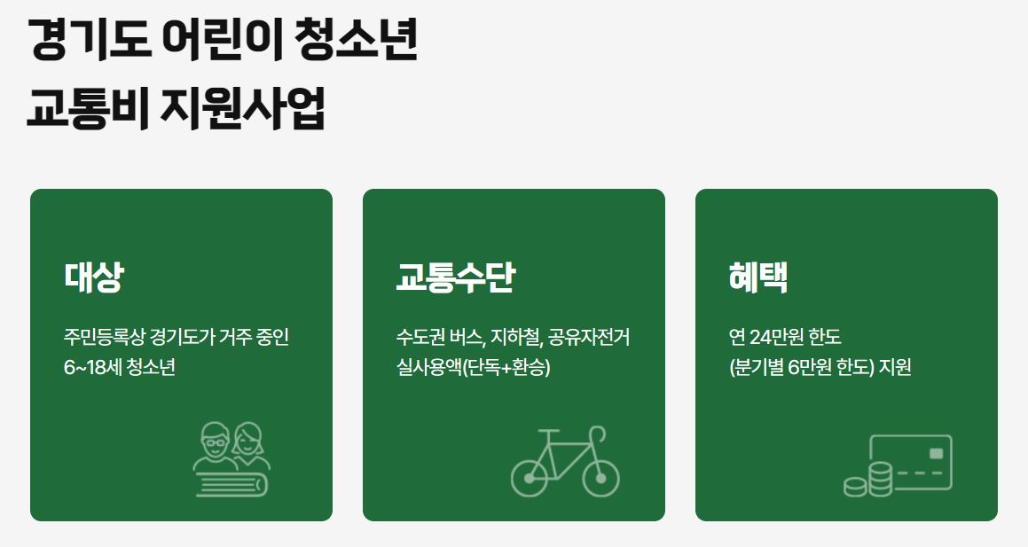 | K-패스 혜택에서 제외된 어린이.청소년 포함 지원 | 기존 청소년 교통비 지원사업 (13~23세, 연 12만원 한도) ▼ 6~18세, 연 24만원 한도 |