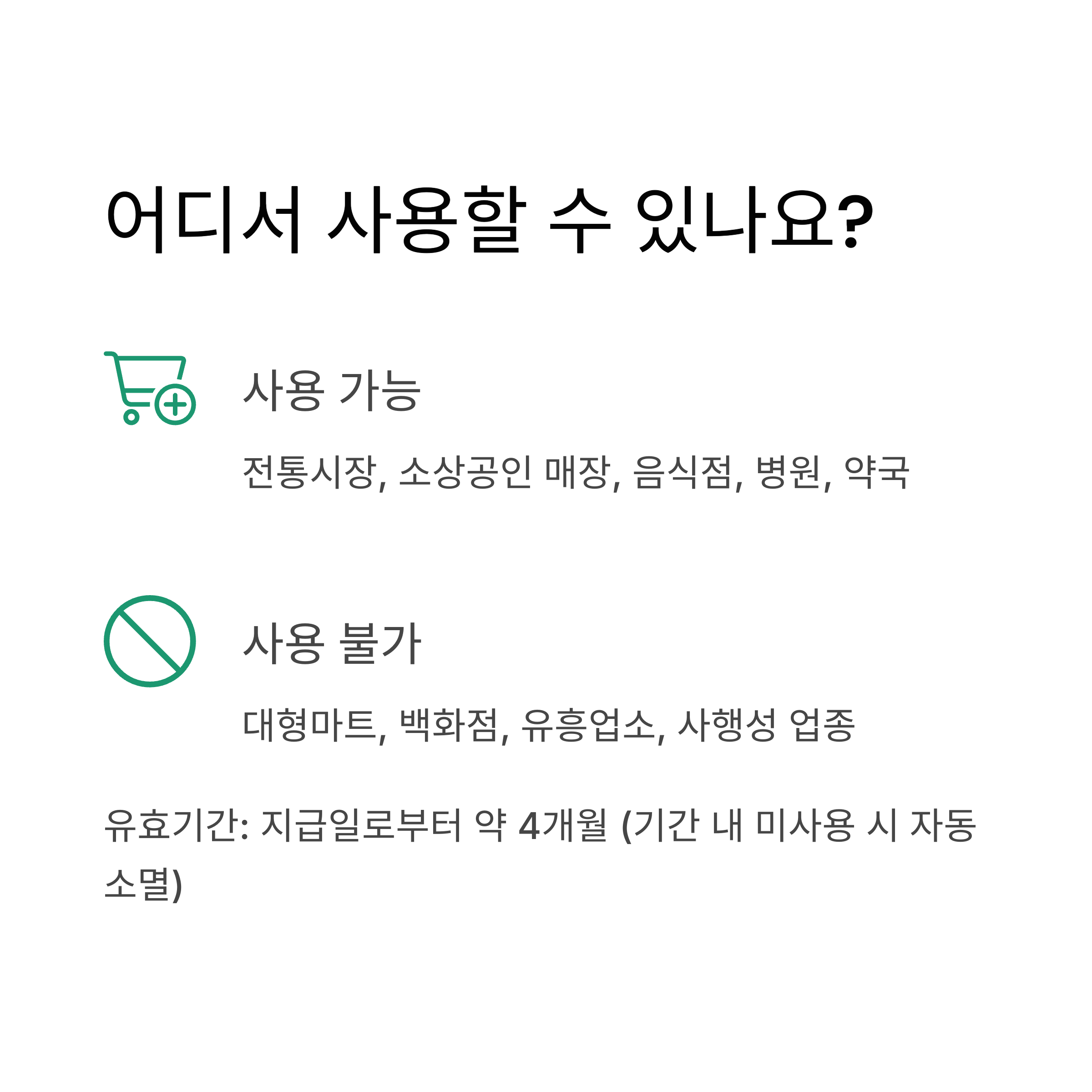• 사용 가능 업종: 전통시장, 소상공인 매장, 음식점, 병원, 약국 등