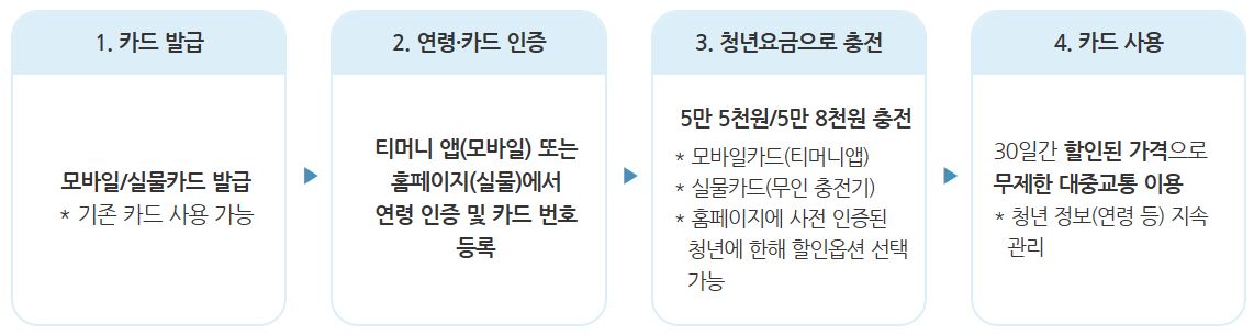 - 티머니 앱(모바일) 또는 홈페이지(실물)에서 연령 인증 및 카드 번호 등록