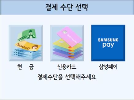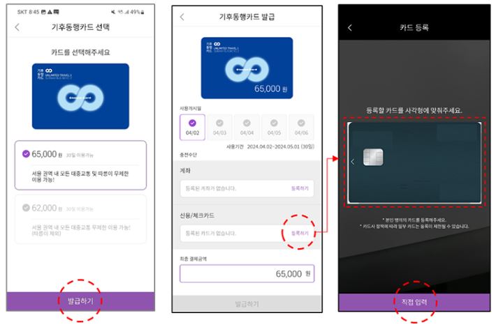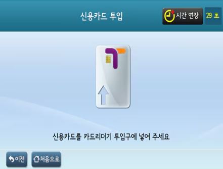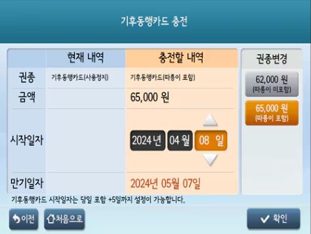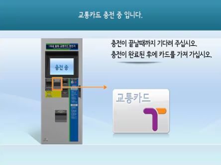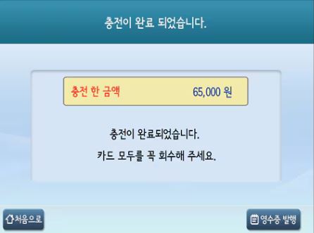 권종 및 시작일자 선택 -> 결제 수단 선택 -> 신용/체크카드 투입 -> 서명 입력 -> 신용/체크카드 승인 -> 충전 중 -> 충전 완료 -> 영수증 발행