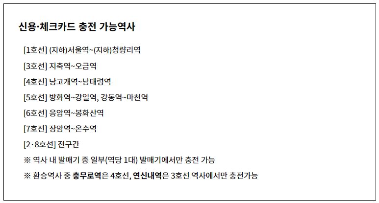 2024년 4월 24일부터 '모바일티머니' 앱을 통해 계좌 등록 이외에도 신용카드 및 체크카드를 등록하고 충전할 수 있게 되며, 사용기간 만료 전(5일전, 3일전, 1일전) 재충전 알림도 가능합니다.