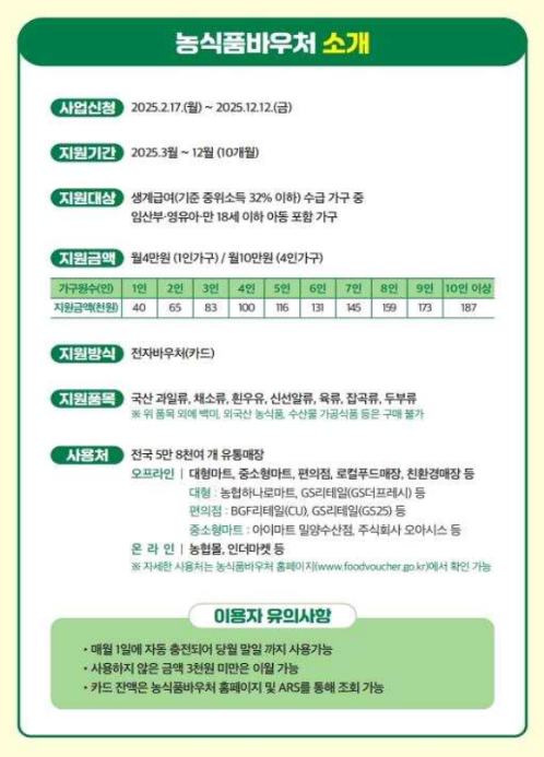 2025년 농식품 바우처 사업은 취약계층 가정의 건강한 식생활을 지원하는 중요한 제도입니다. 해당 대상자는 기간 내에 꼭 신청하여 혜택을 누리시길 바랍니다.
