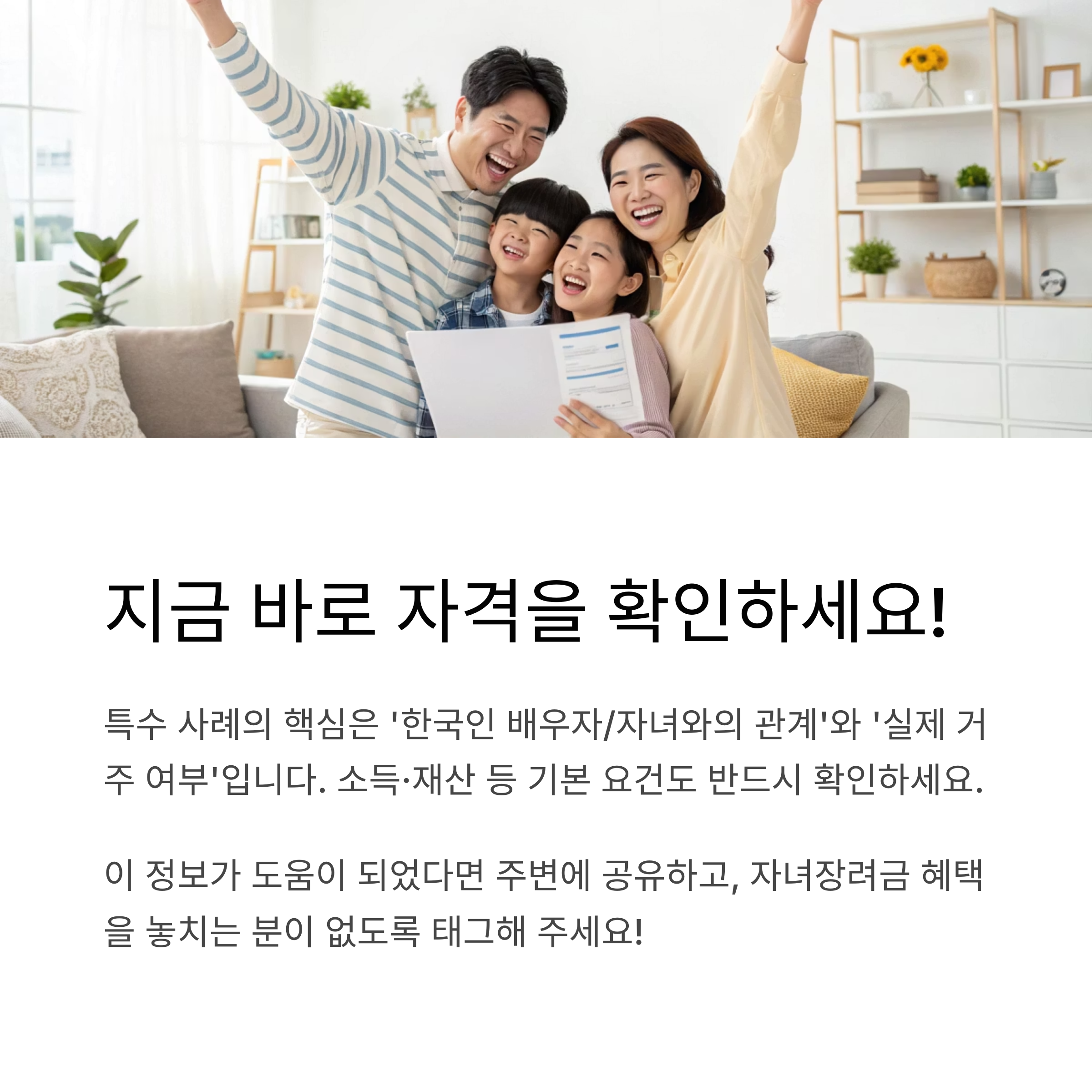 외국인 배우자, 이혼 가정, 재혼 가정 등은 자격 요건을 잘못 이해해 신청 기회를 놓치는 경우가 많습니다. 지금 바로 본인 상황에 맞는 신청 자격을 확인하세요!