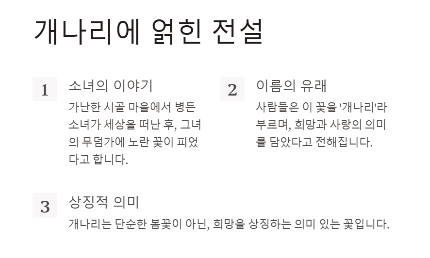 사람들은 이 꽃을 ‘개나리’라 부르며, 희망과 사랑의 의미를 담았다고 전해짐