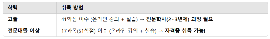 💡 즉, 전문대졸 이상이라면 과정만 이수하면 되지만, 고졸자는 학위 취득이 우선 필요합니다.