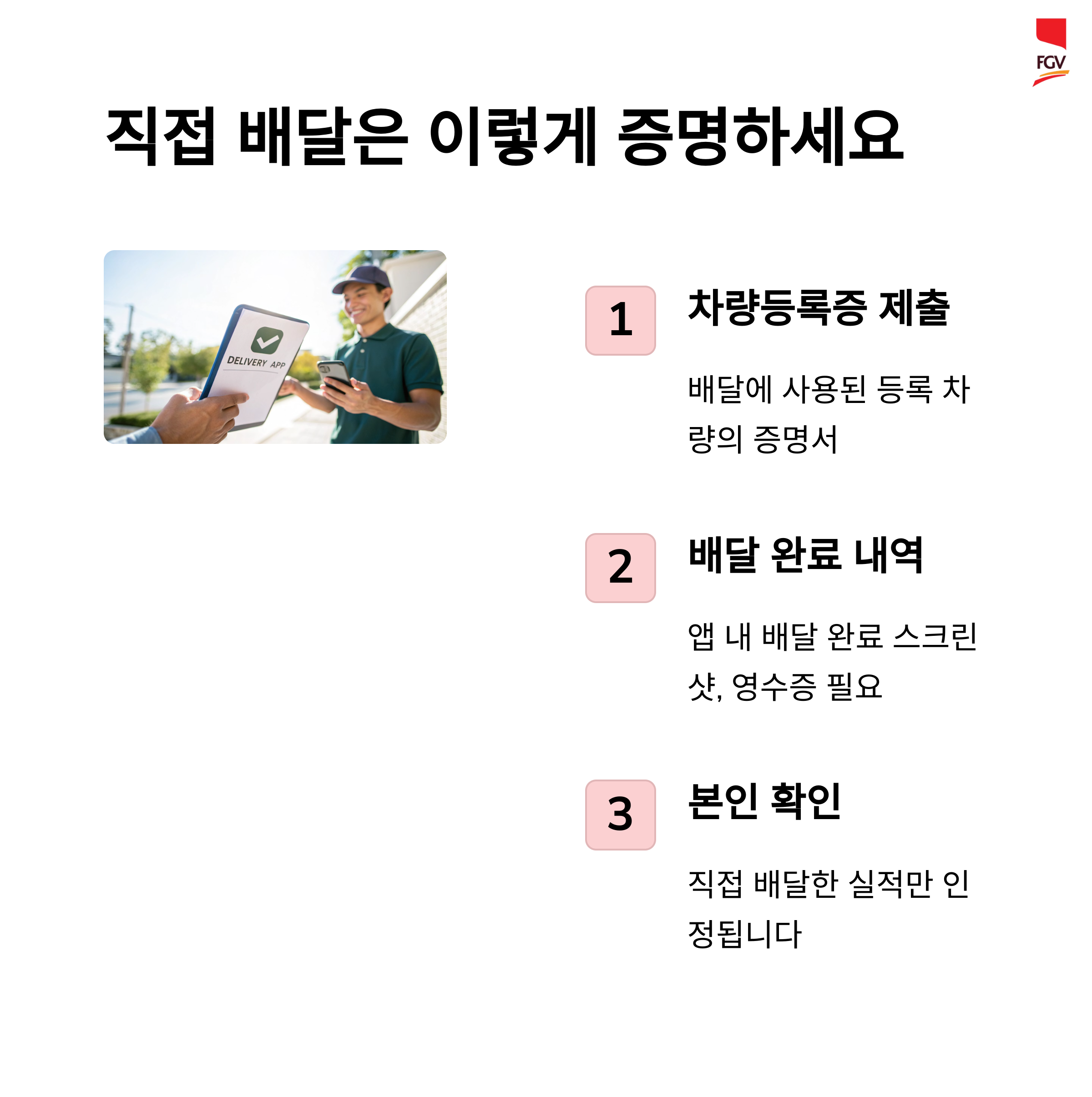 ➡ 직접 배달도 인정되지만, 운송 수단 등록과 실적 증빙이 모두 필요합니다.