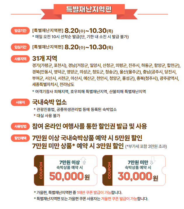 올해는 총 80만 장의 할인권이 배포되며, 특별재난지역에는 7만 2천 장의 전용 쿠폰이 추가 제공된다고 하니 여행비가 부담스러워 망설였다면, 이번 기회를 꼭 잡아야겠죠?