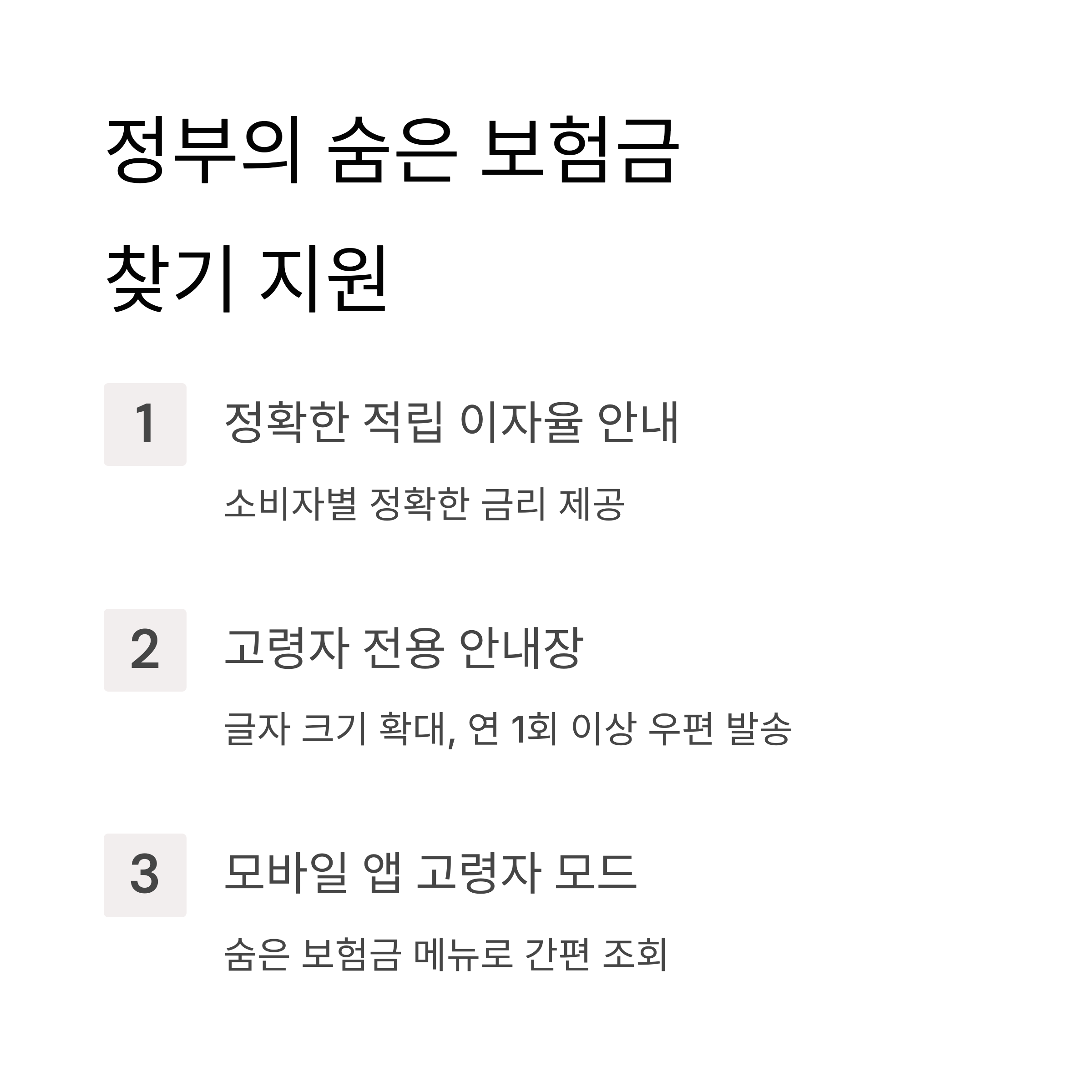 - 모바일 앱 고령자 모드: 숨은 보험금 메뉴 추가로 간편 조회 가능