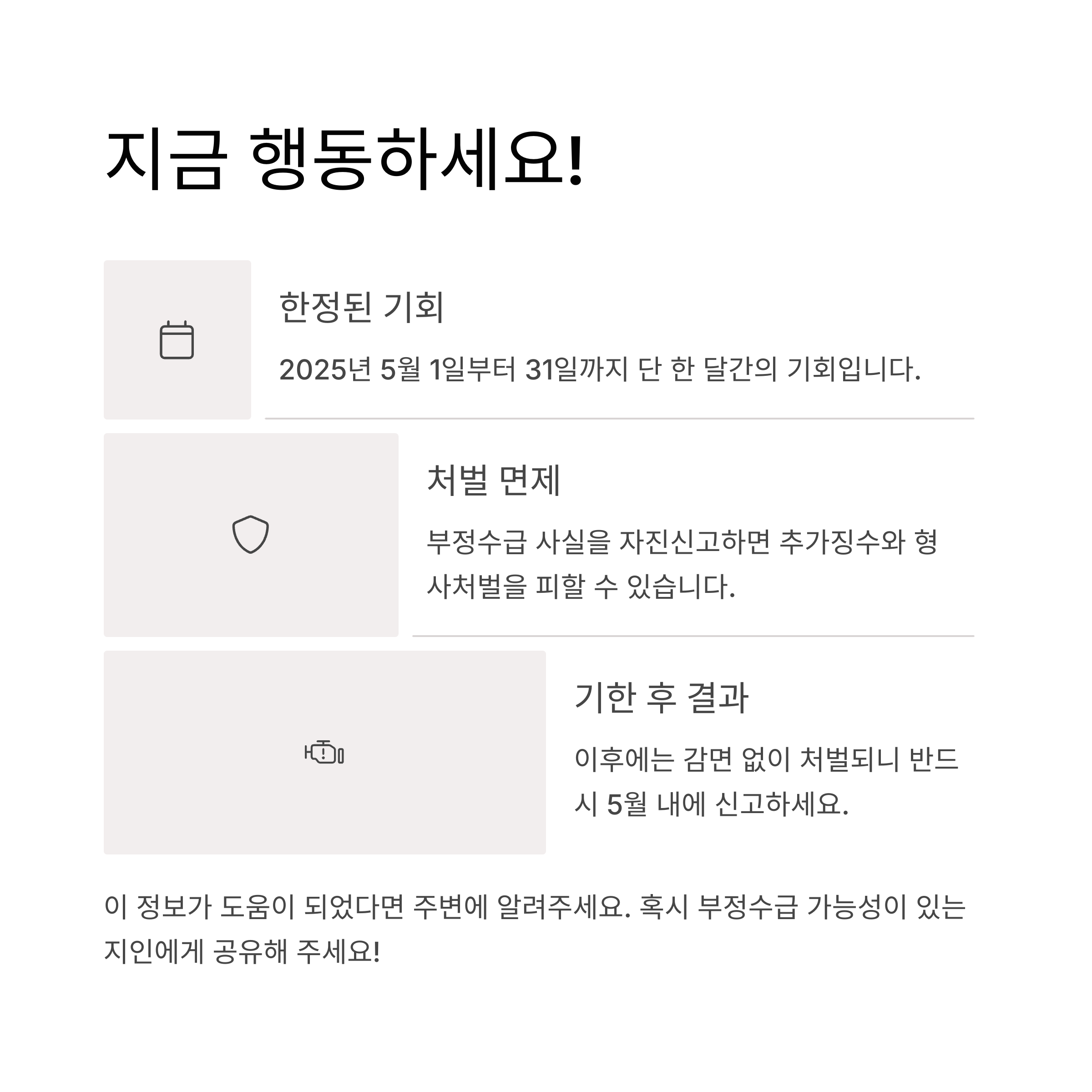 → 이후 적발 시, 감면 없이 처벌되므로 반드시 5월 내에 신고하세요.