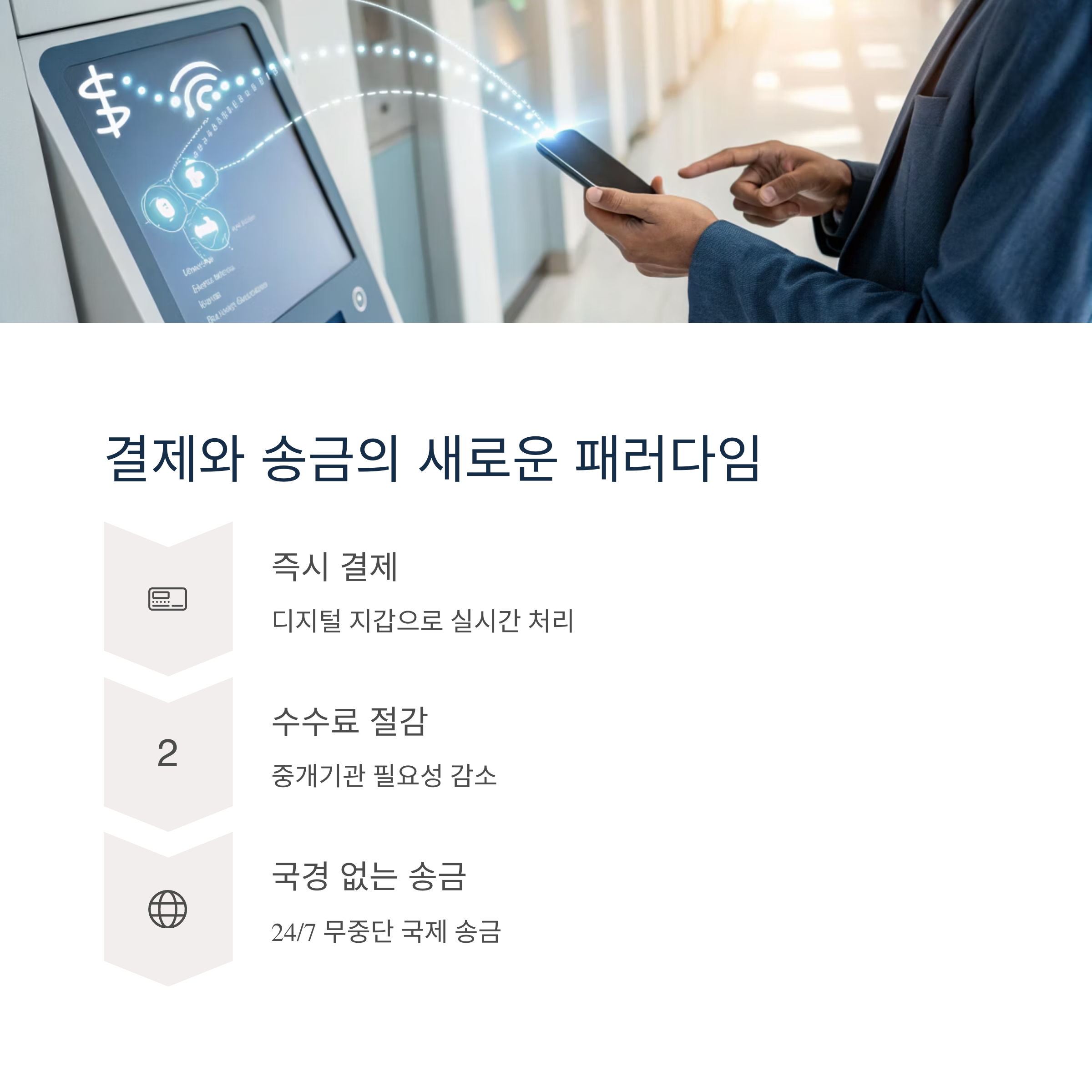 별도 중개 기관 없이도 즉시 정산이 가능하며, 국제 송금의 경우도 비용 절감과 시간 단축 효과가 큽니다.