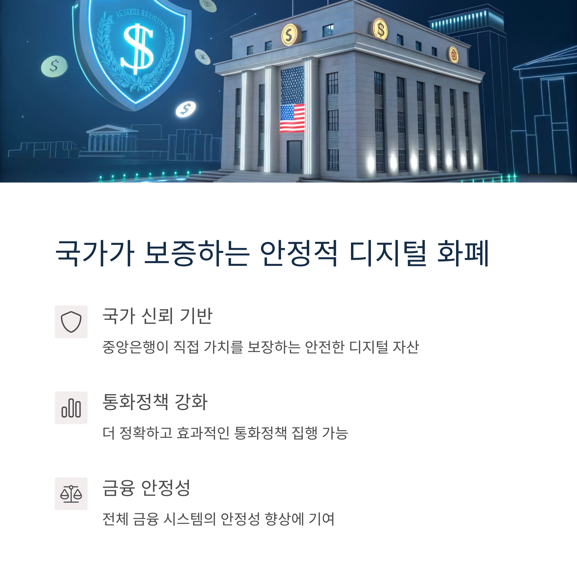 비트코인, 이더리움 같은 민간 암호화폐와 달리 가격 변동성이 없고, 중앙은행이 발행과 거래 기록을 관리하므로 가치 안정성이 높습니다.