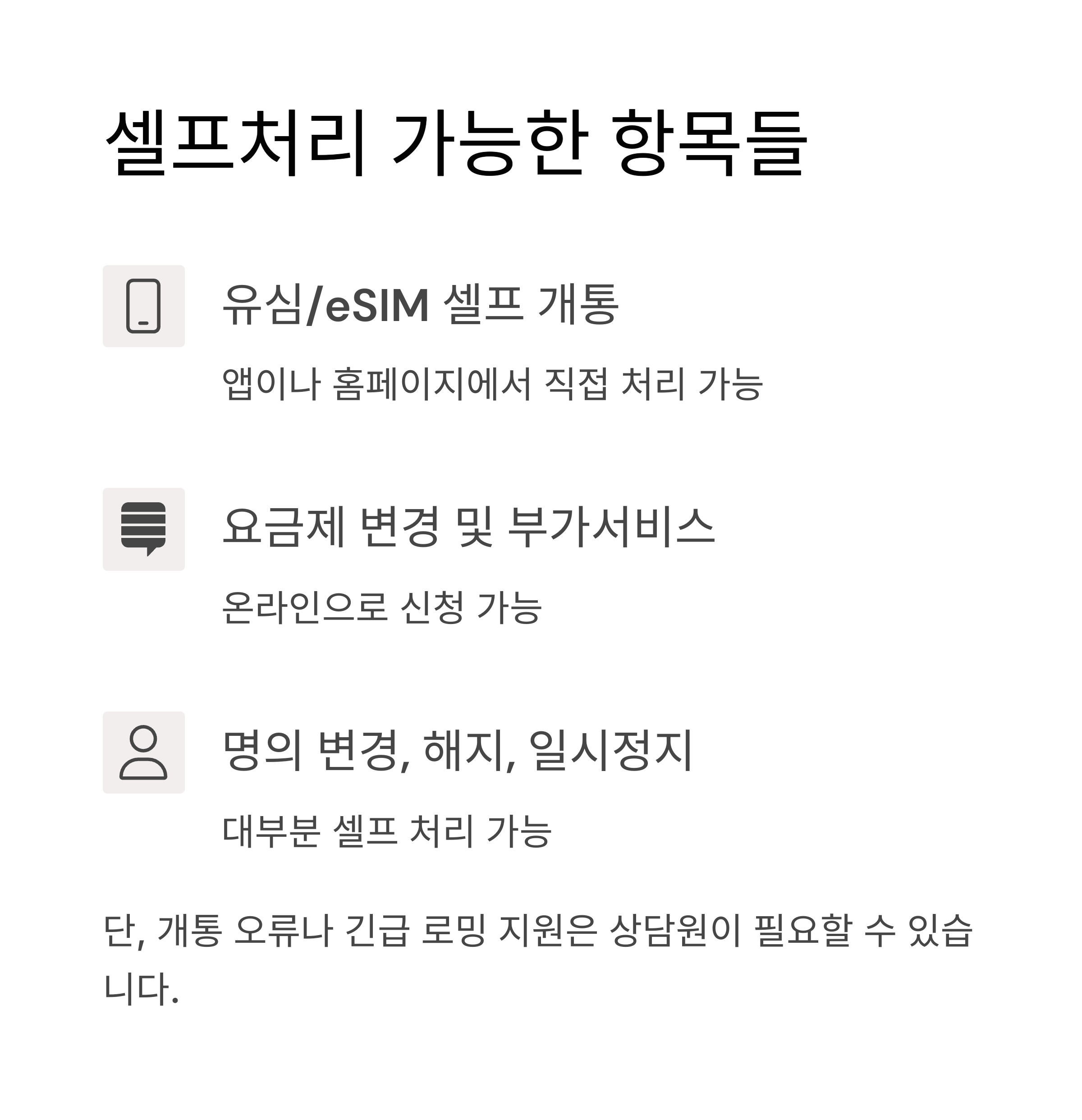 단, 개통 오류나 긴급 로밍 지원은 여전히 상담원이 필요할 수 있습니다.