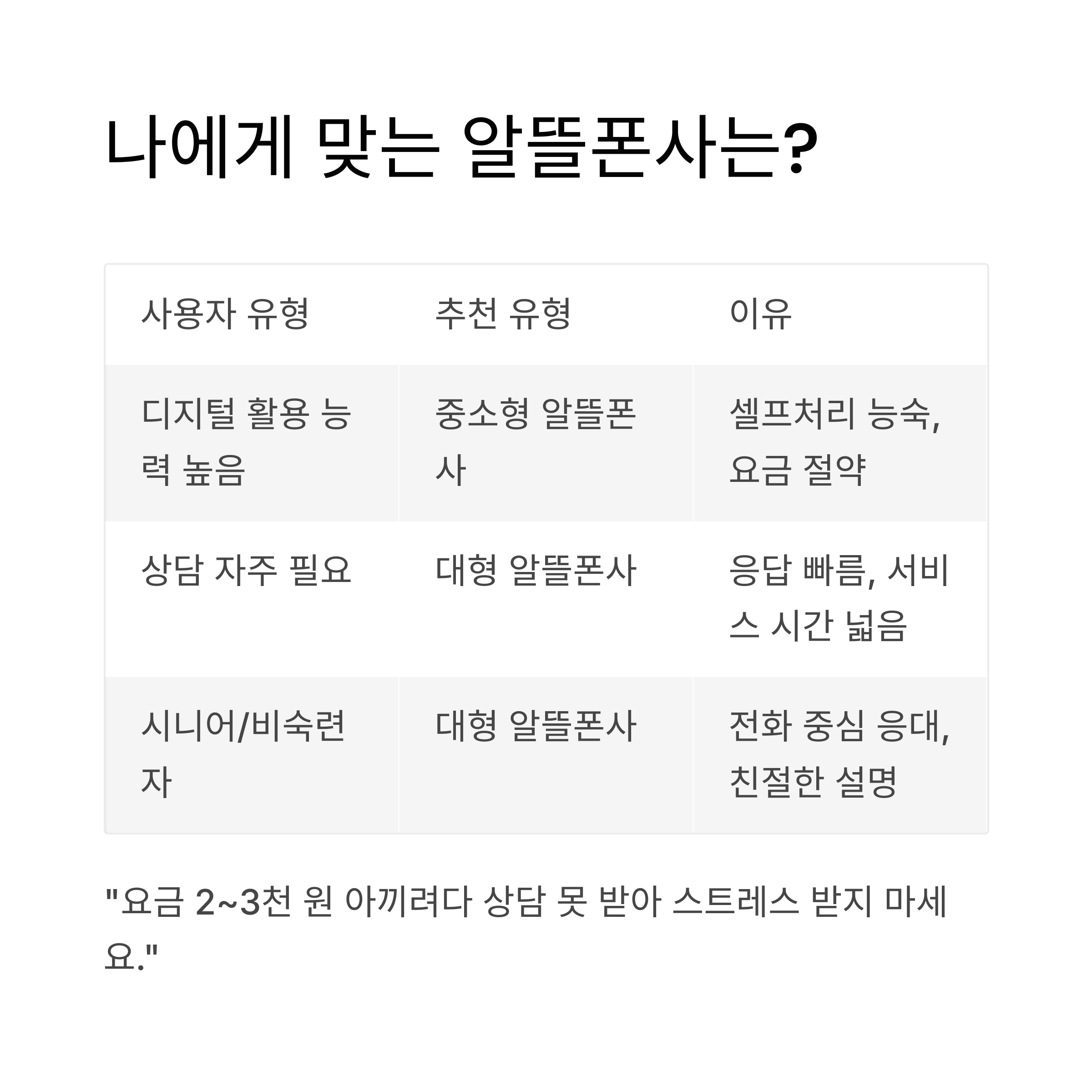 | 시니어/비숙련 사용자 | 대형 알뜰폰사 | 전화 중심 응대, 설명 친절 |