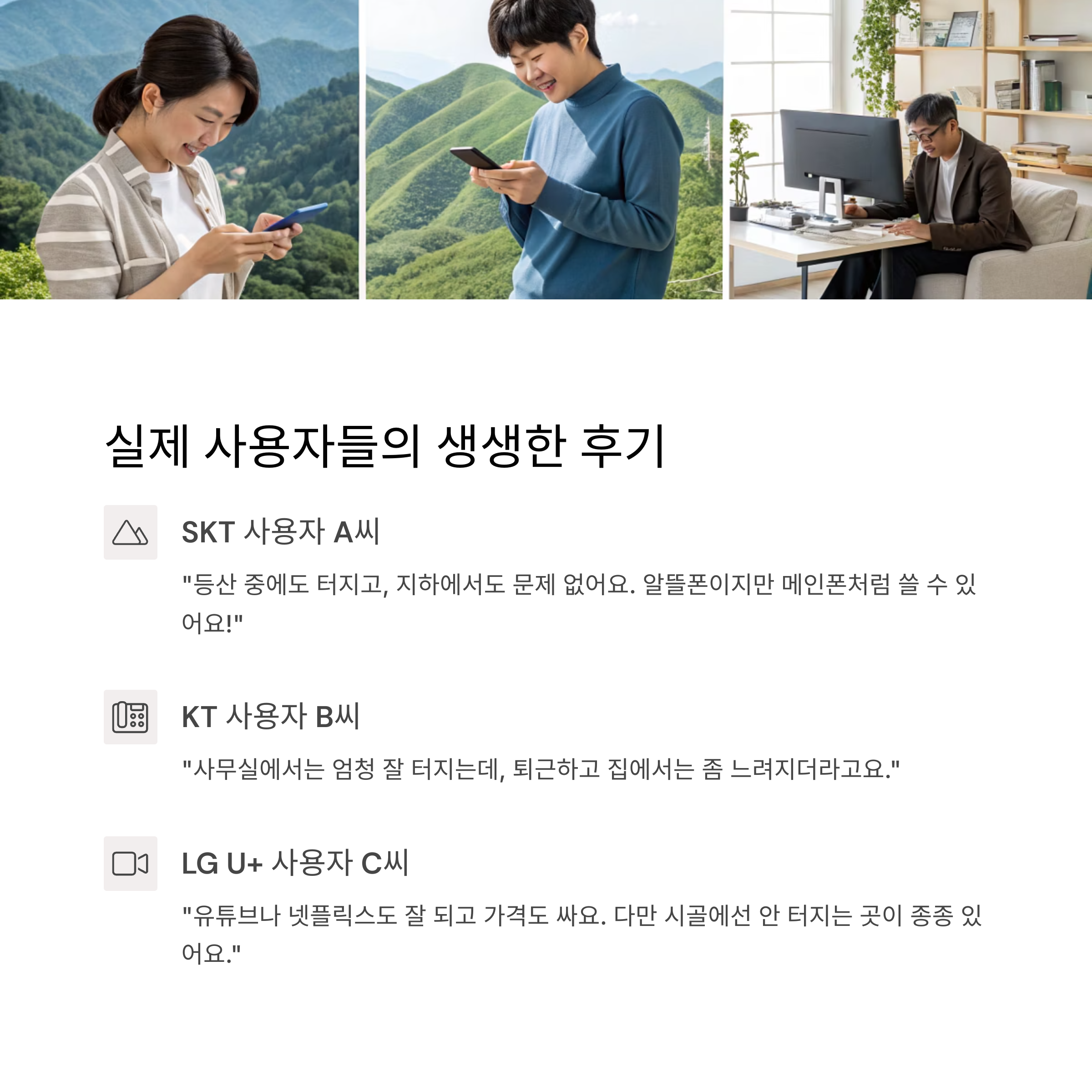 : "동일 요금제라도 통신망과 사업자에 따라 체감 속도가 다르니, 실사용 후기 참고는 필수!"
