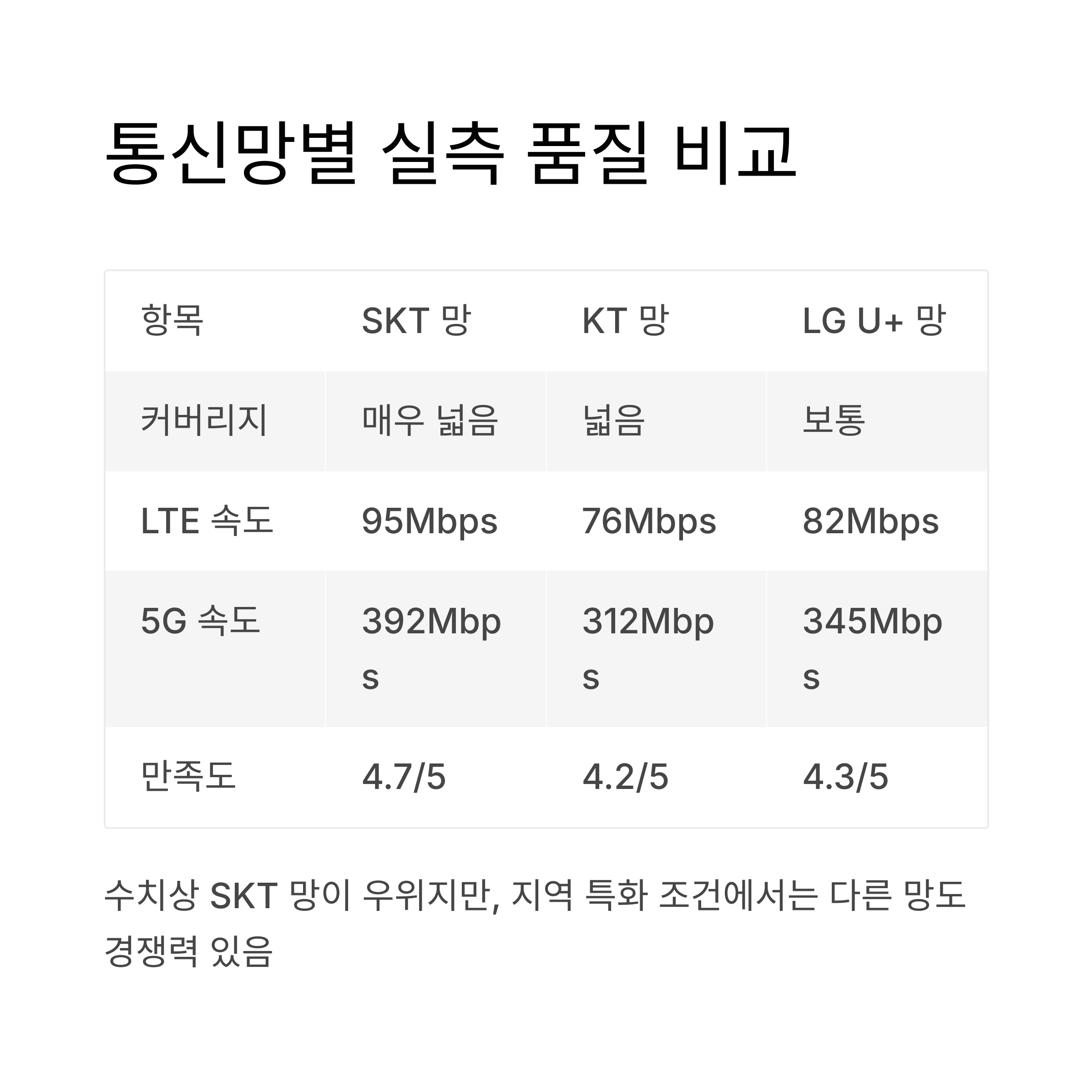 실측 데이터 기반 통신망 품질 비교표
