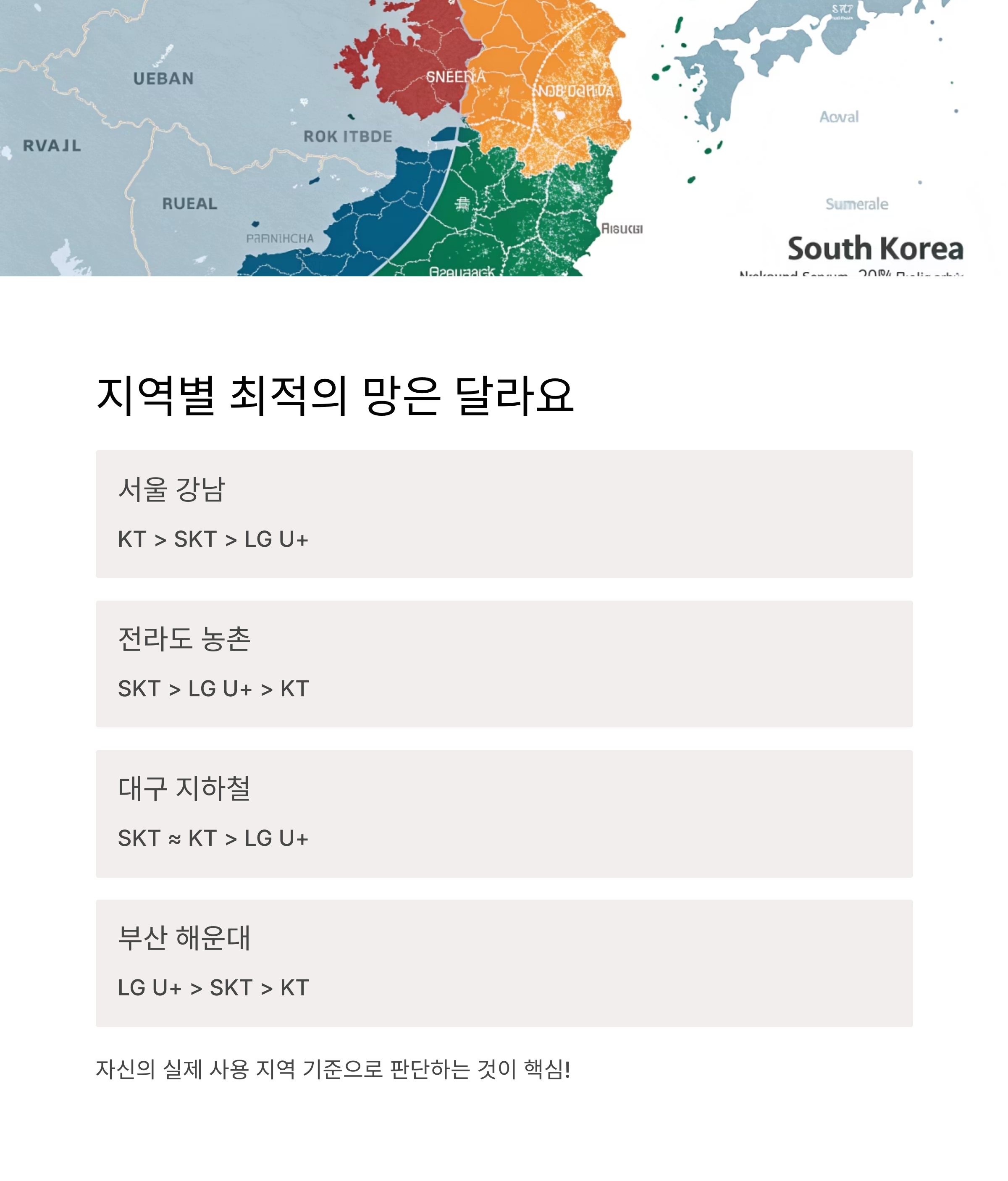 • 전라도 농촌 지역: SKT > LG U+ > KT