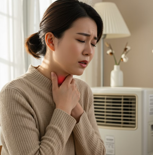 ✔ 밤새 에어컨을 켜둔 경우, 아침에 목이 붓거나 통증이 느껴질 수 있음