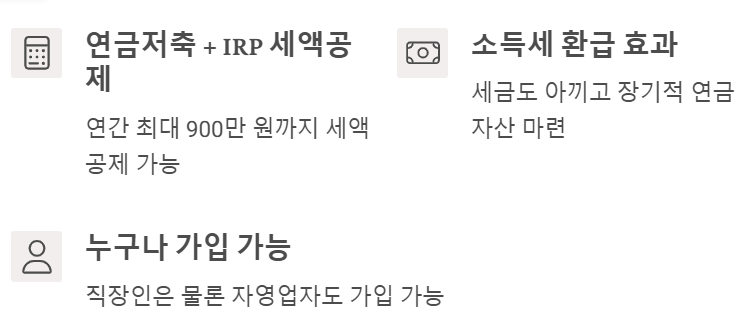• 연금저축 + IRP를 합쳐 연간 최대 900만 원까지 세액공제 가능