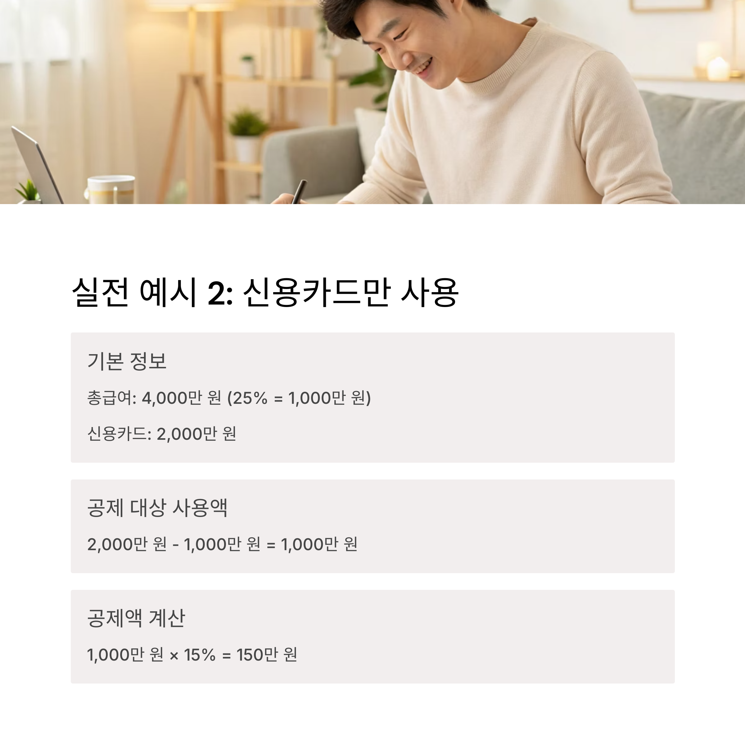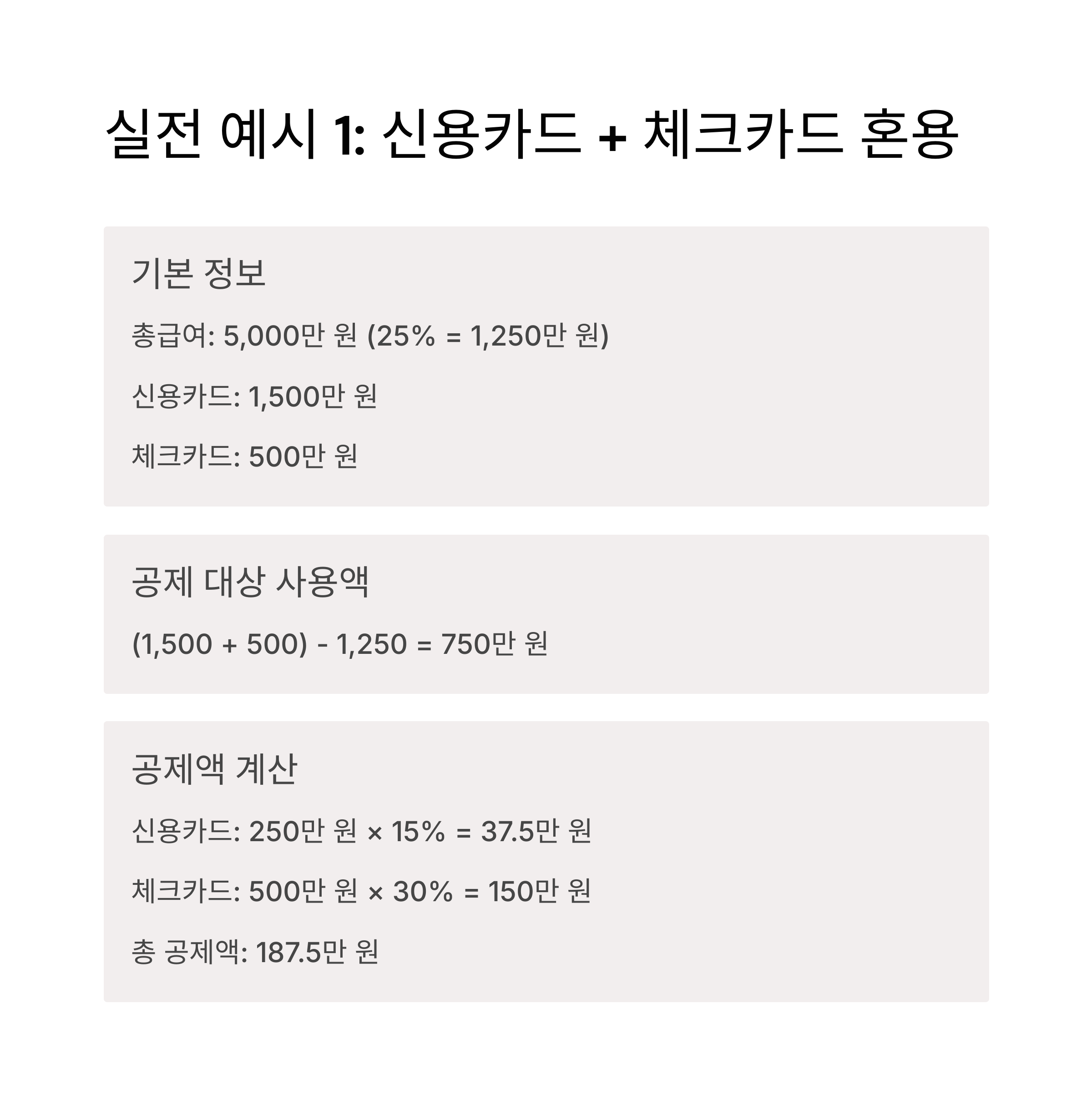 - 신용카드: 250만 원 × 15% = 37.5만 원