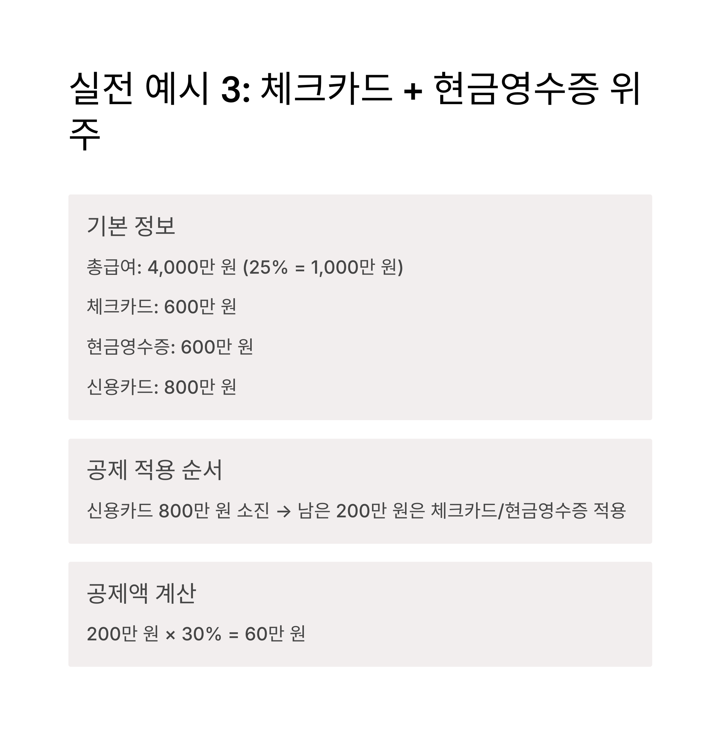 👉 총급여의 25%까지는 신용카드, 이후 초과분은 체크카드 또는 현금영수증 사용이 유리합니다.