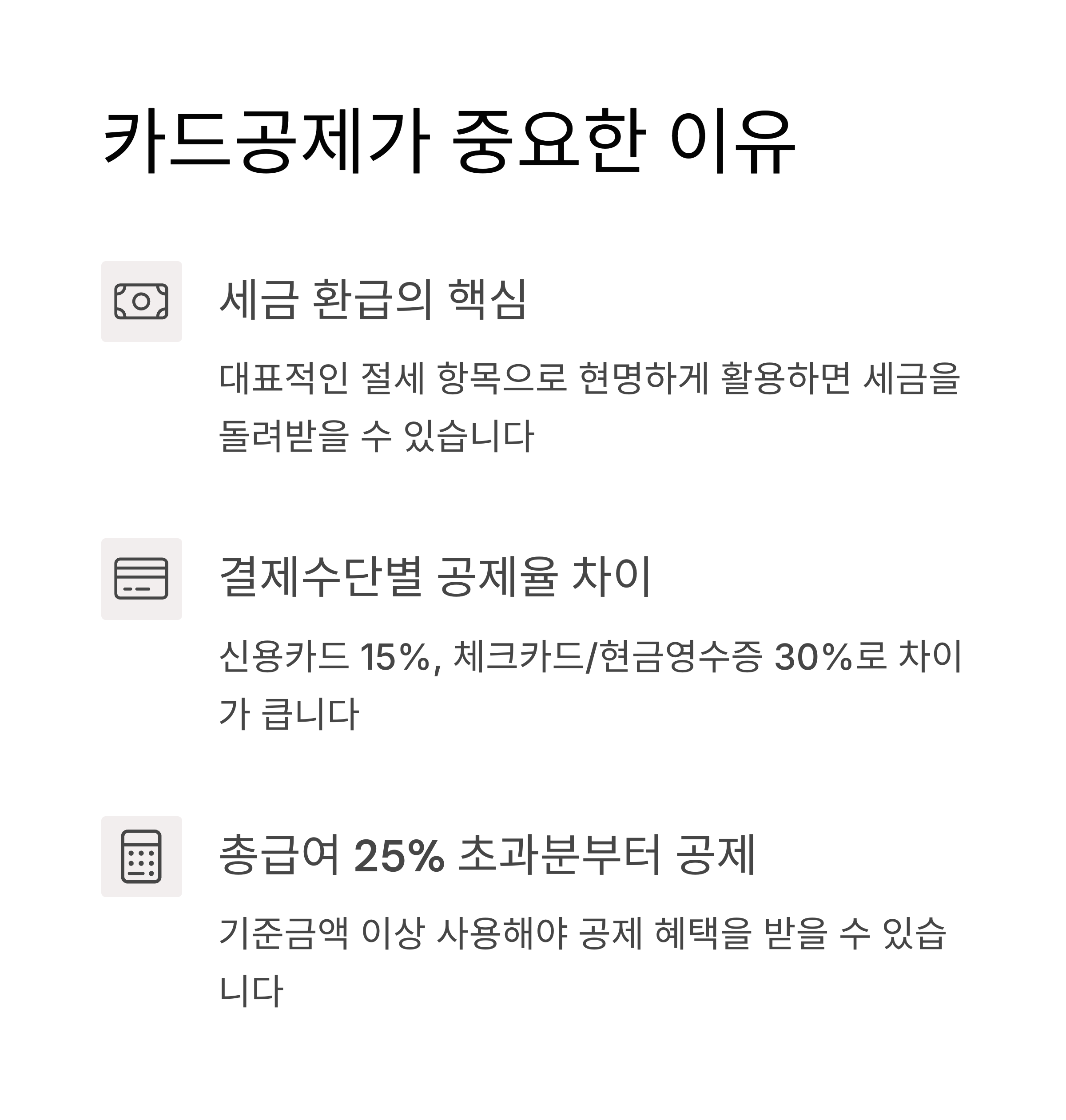 - ✅ 결제 수단에 따라 공제율 차이! (신용카드 15%, 체크카드/현금영수증 30%)