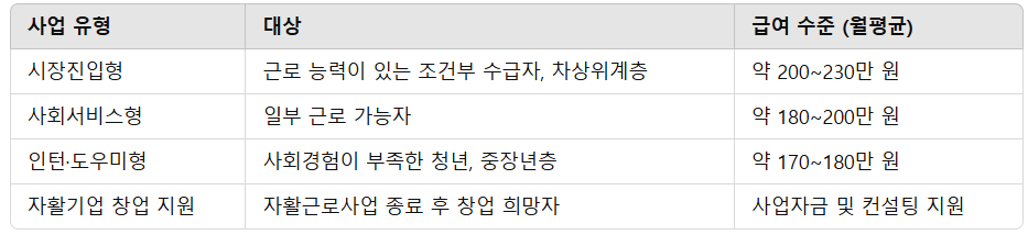 자활근로사업 참여자는 근무 형태에 따라 급여를 받게 됩니다. 일반적으로 월 170~230만 원 정도이며, 유형에 따라 차이가 있습니다.