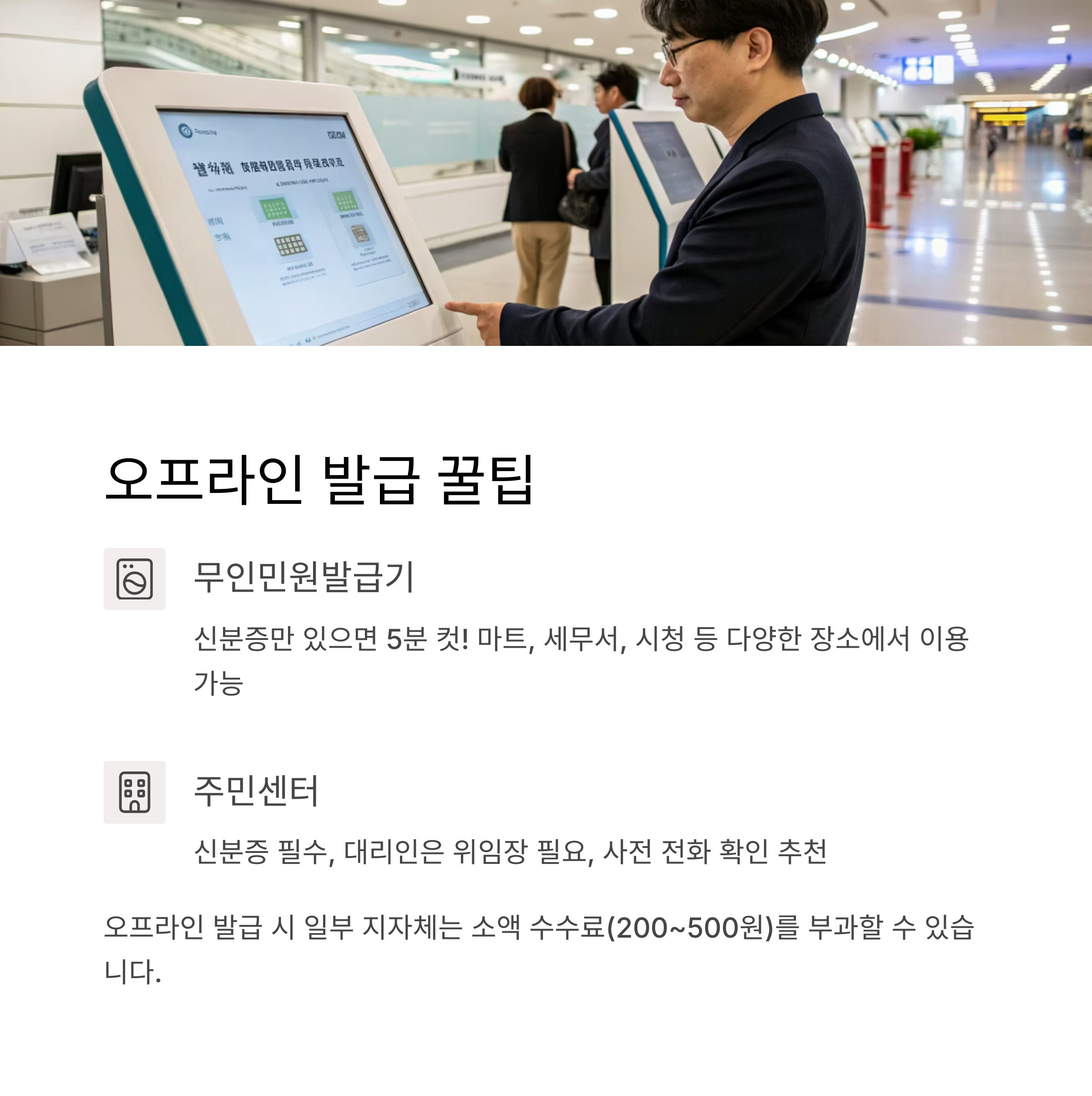 오프라인 발급 시 일부 지자체는 소액 수수료(200~500원)를 부과할 수 있습니다.