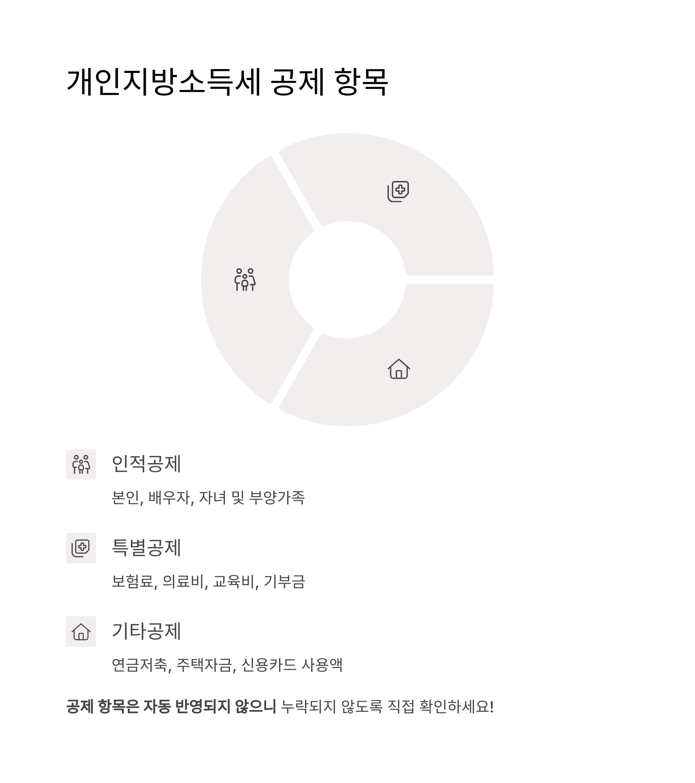 - 특별공제: 보험료, 의료비, 교육비, 기부금