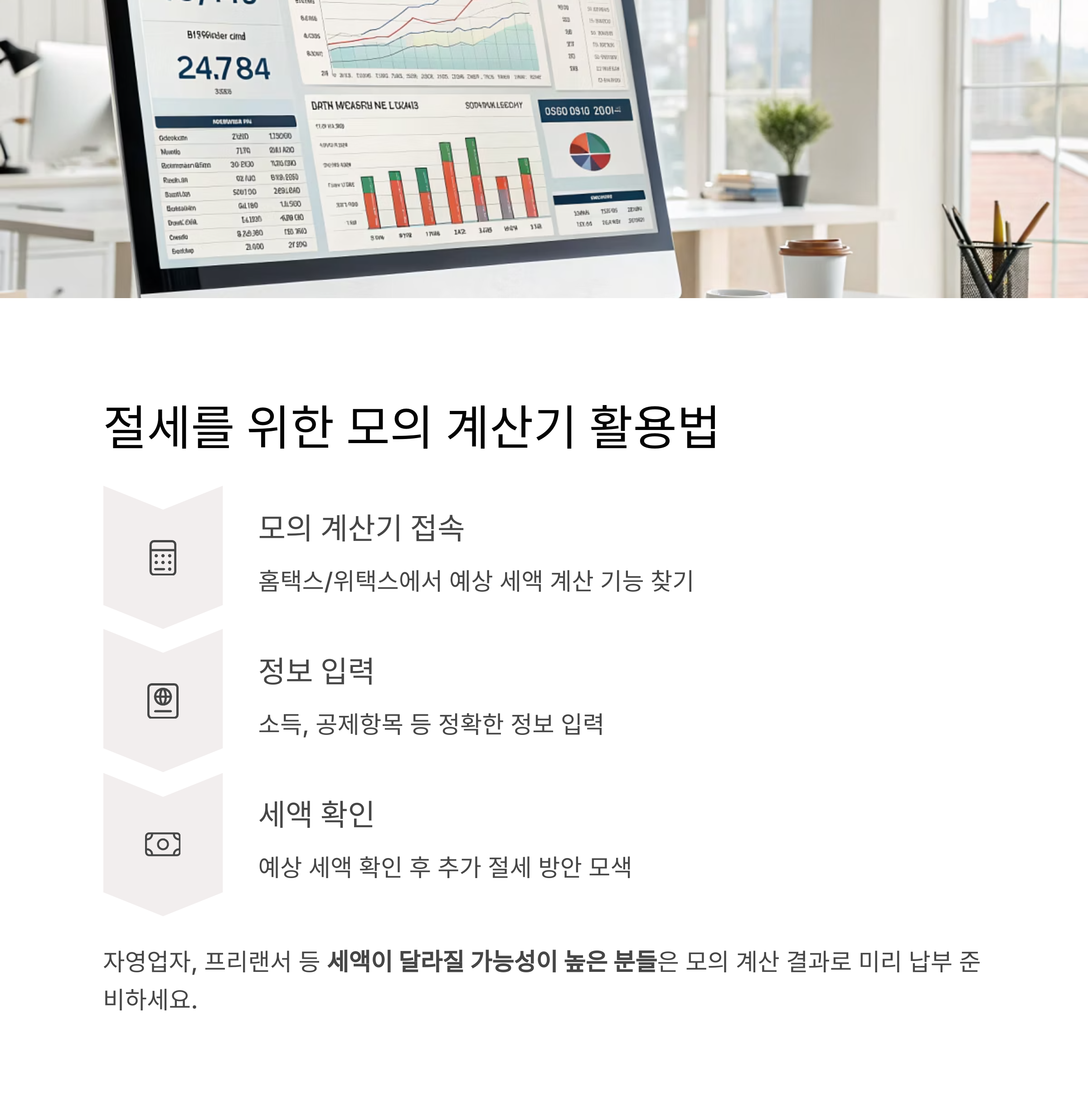 "모의 계산 결과를 토대로 미리 납부 준비"를 해두는 것이 절세의 시작입니다.