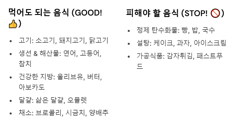 ✅ 탄수화물 섭취량: 하루 총 열량의 5~10% (50g 이하)✅ 지방 섭취량: 하루 총 열량의 60~75%