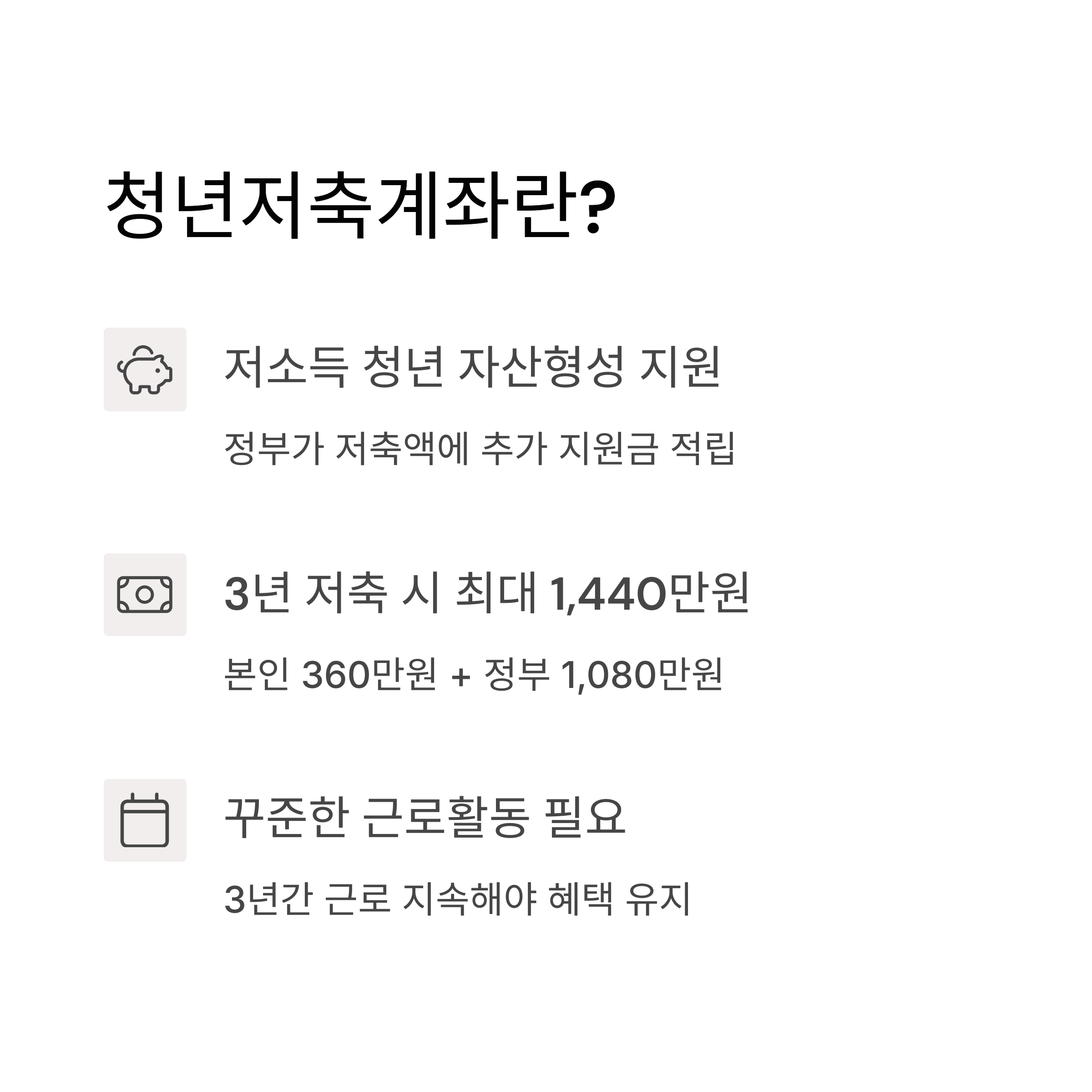 청년저축계좌는 저소득 청년층이 꾸준히 저축하며 자산을 형성할 수 있도록 돕는 정부 지원 제도입니다. 매월 일정 금액을 저축하면, 정부가 추가로 지원금을 적립해 주는 방식이죠. 3년 동안 성실히 저축하고 근로 활동을 이어가면, 최대 1,440만 원까지 목돈 마련이 가능합니다.