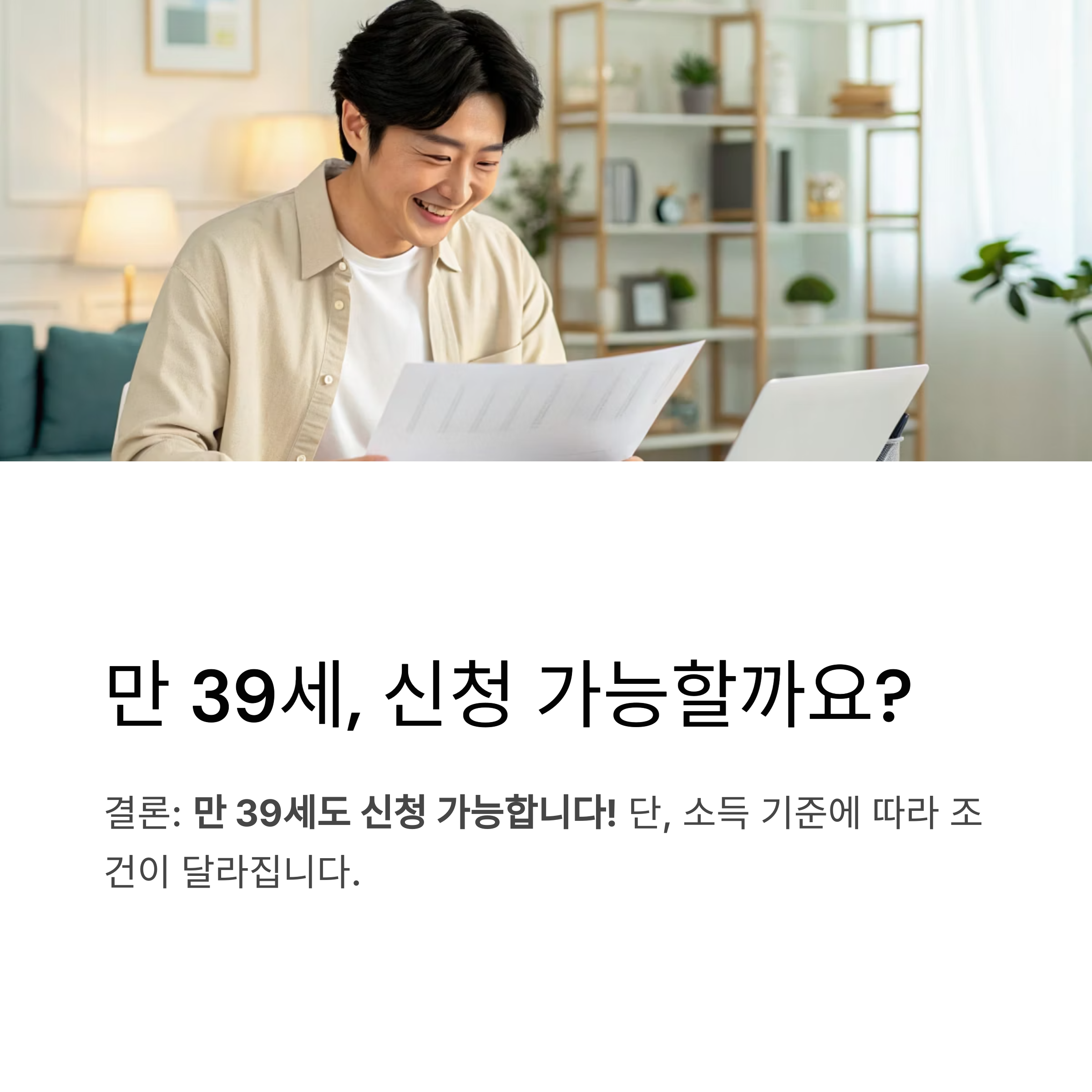 • 즉, 기초생활수급자, 차상위계층, 또는 기준 중위소득 50% 이하에 해당하는 경우에 한해 만 39세도 신청할 수 있습니다.