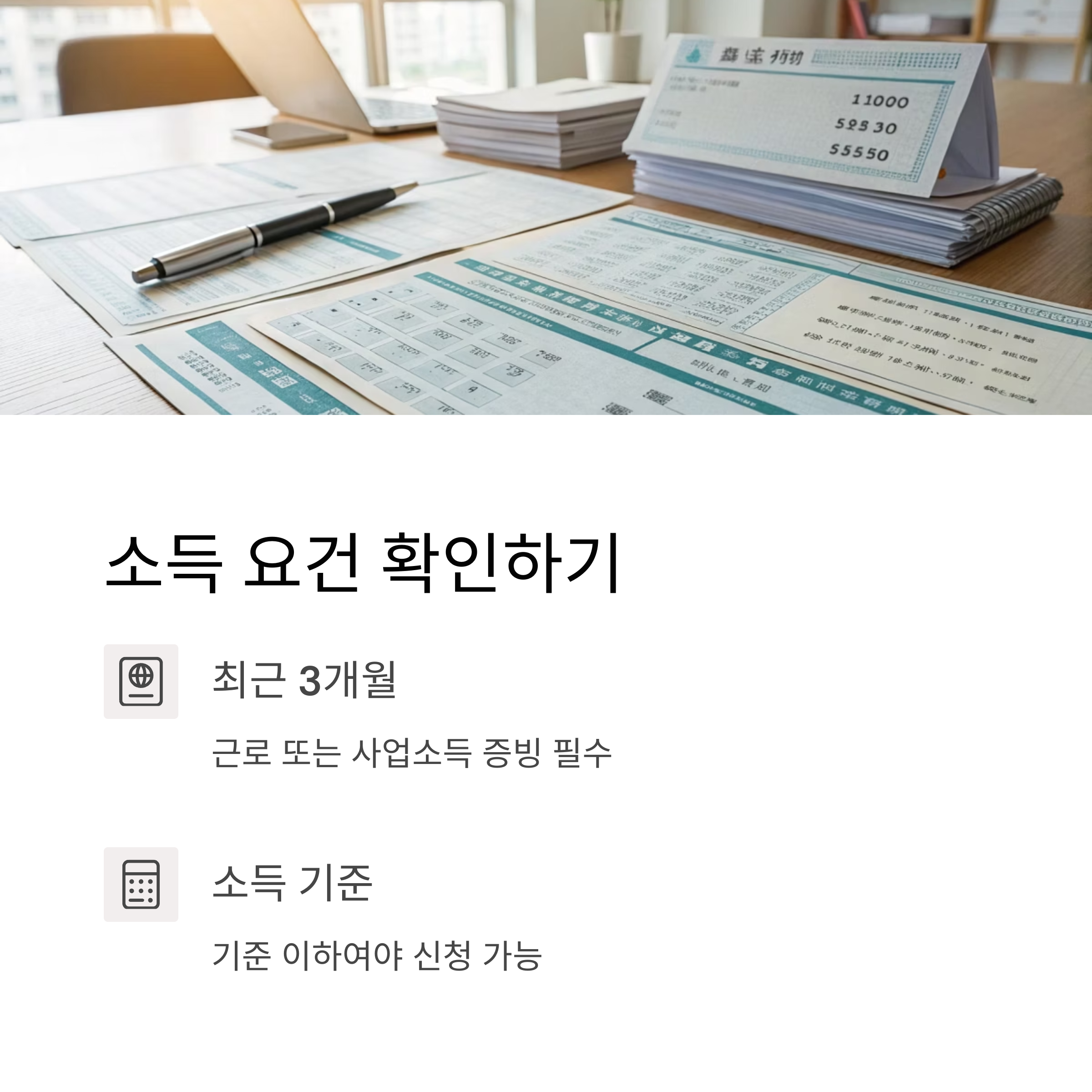 • 최근 3개월 이상 근로 또는 사업소득이 있어야 하며, 소득 기준도 충족해야 합니다.