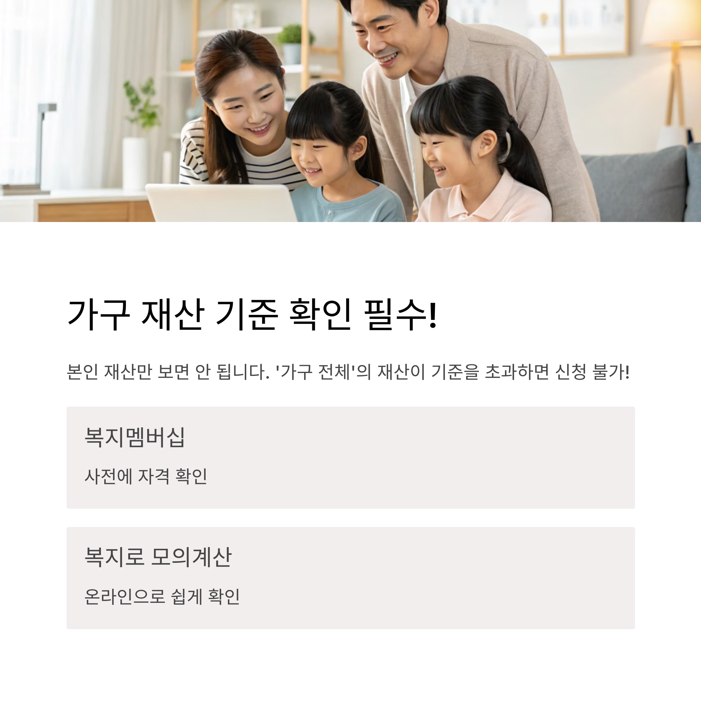 • ‘가구 전체’의 재산이 기준을 초과하면 신청 불가합니다.