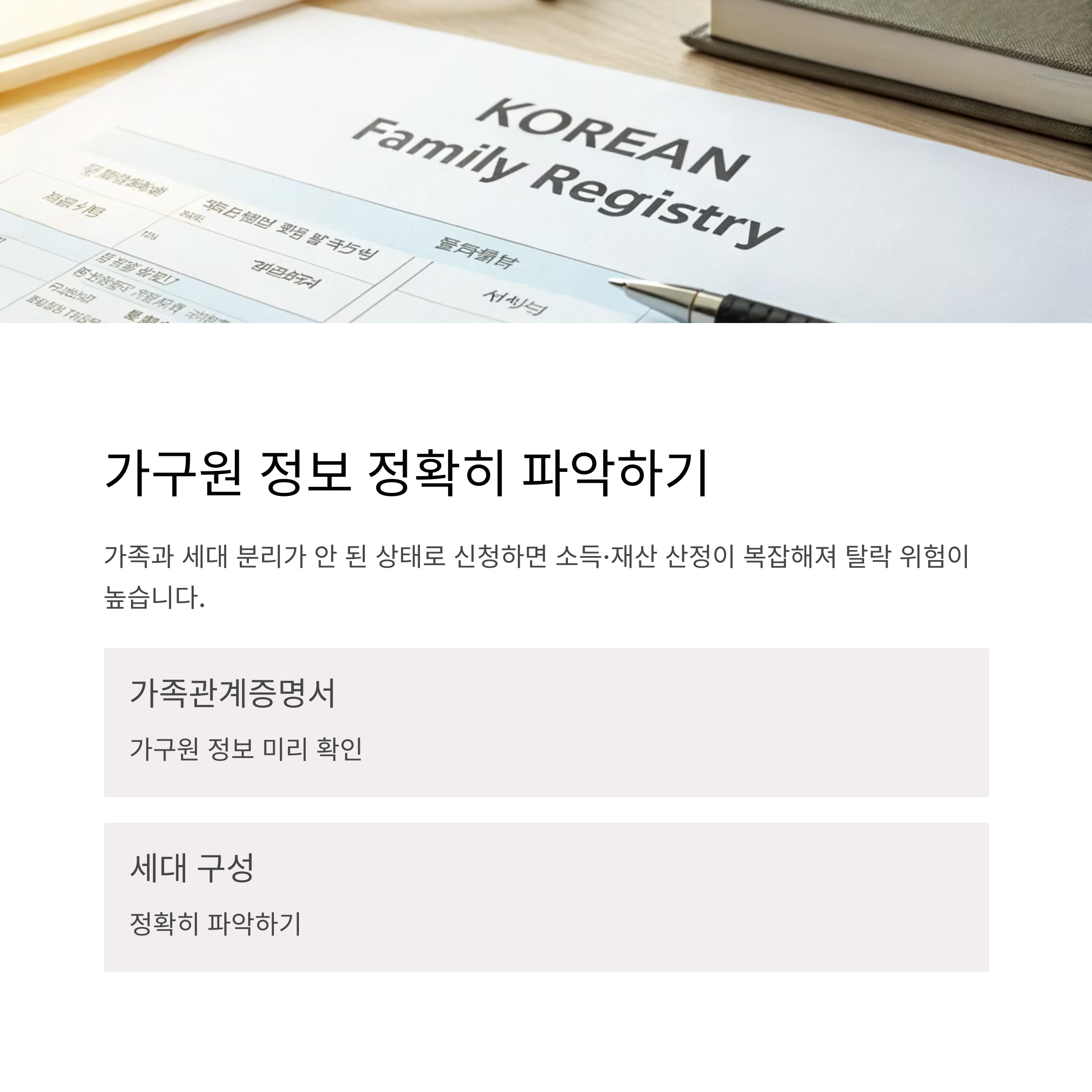 • 가족과 세대 분리가 안 된 상태로 신청하면 소득·재산 산정이 복잡해져 탈락 위험이 높습니다.