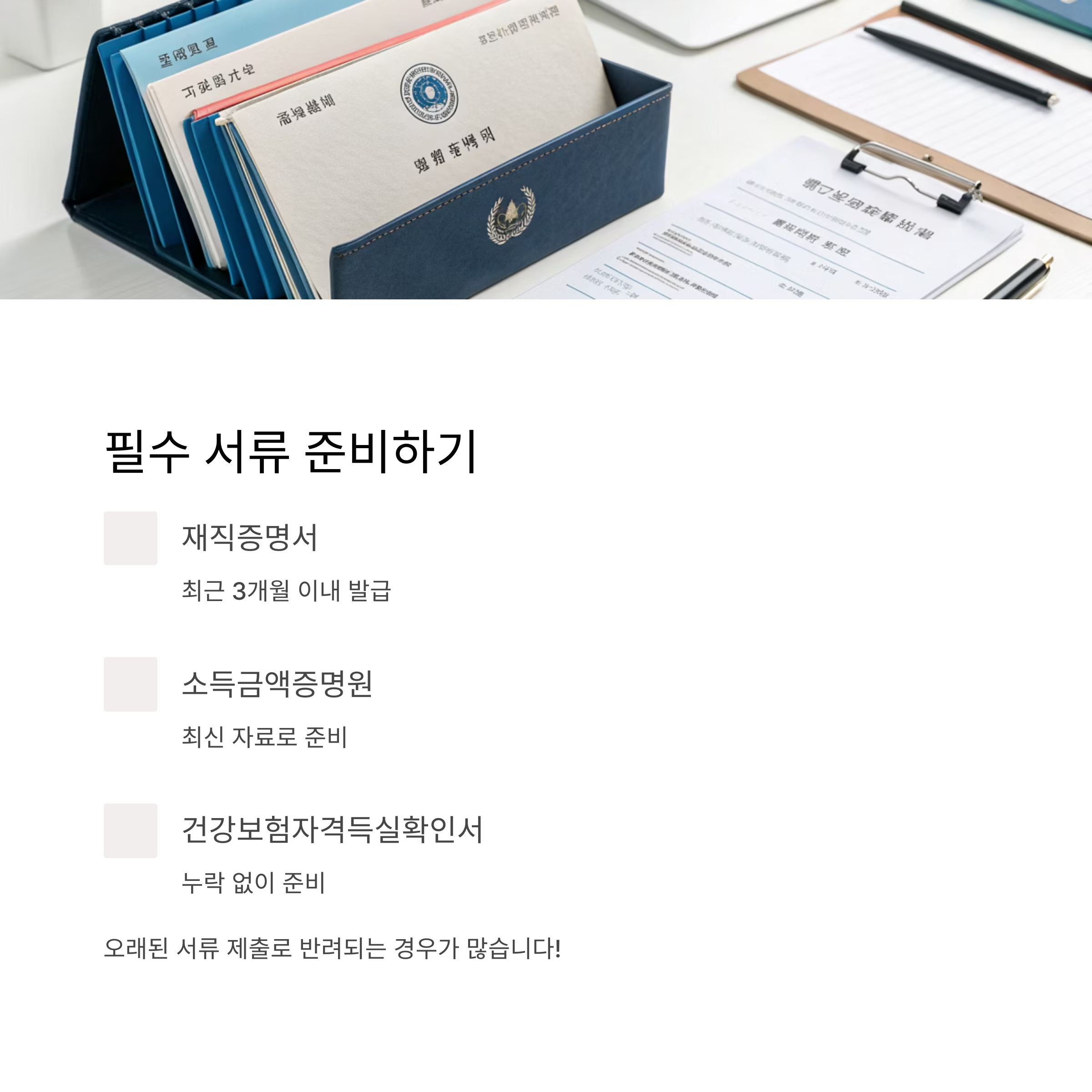 서류 준비 철저: 모든 서류는 최신 3개월 이내 발급본으로 준비하고, 누락 없는지 두 번 체크!