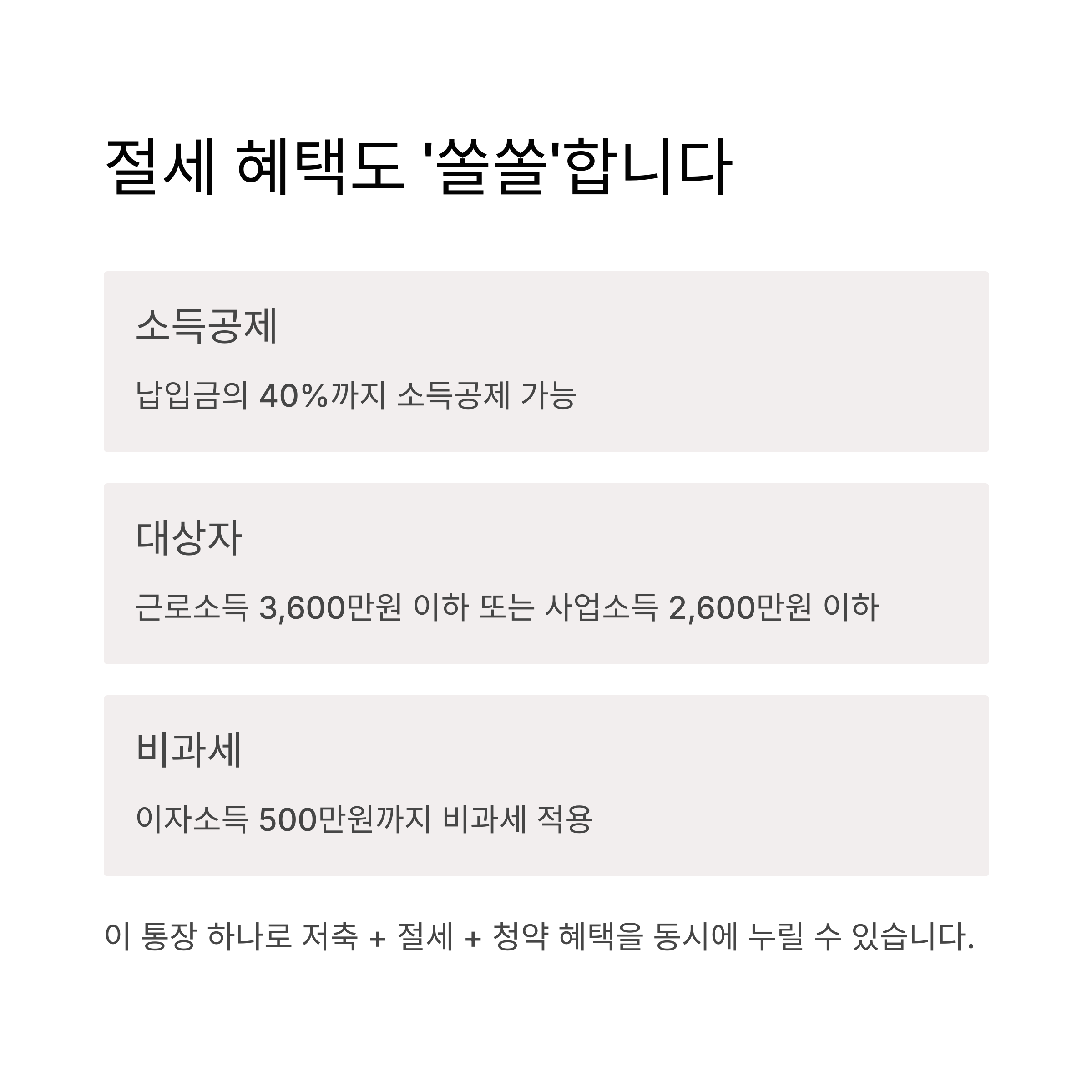 즉, 이 통장 하나로 저축 + 절세 + 청약 혜택을 동시에 누릴 수 있습니다.