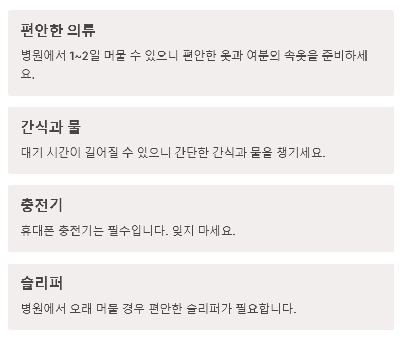 ✔ 편안한 옷 & 여분 속옷 → 보호자도 병원에서 1~2일 머물 수 있어요.