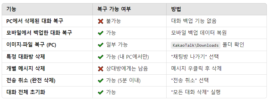 💡 즉, PC 버전에서 삭제된 대화는 카카오톡 자체 기능으로는 복구할 수 없고, 모바일 백업 데이터를 활용해야 합니다!