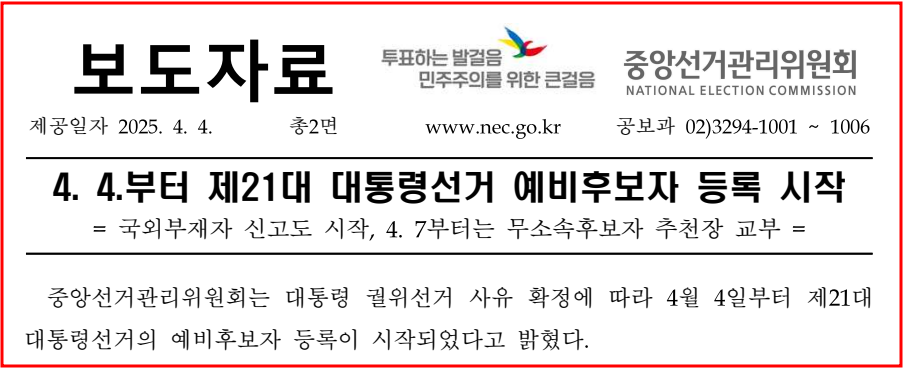 - 대통령 선거일: 2025년 6월 3일 전후로 예정 (헌법상 60일 이내)