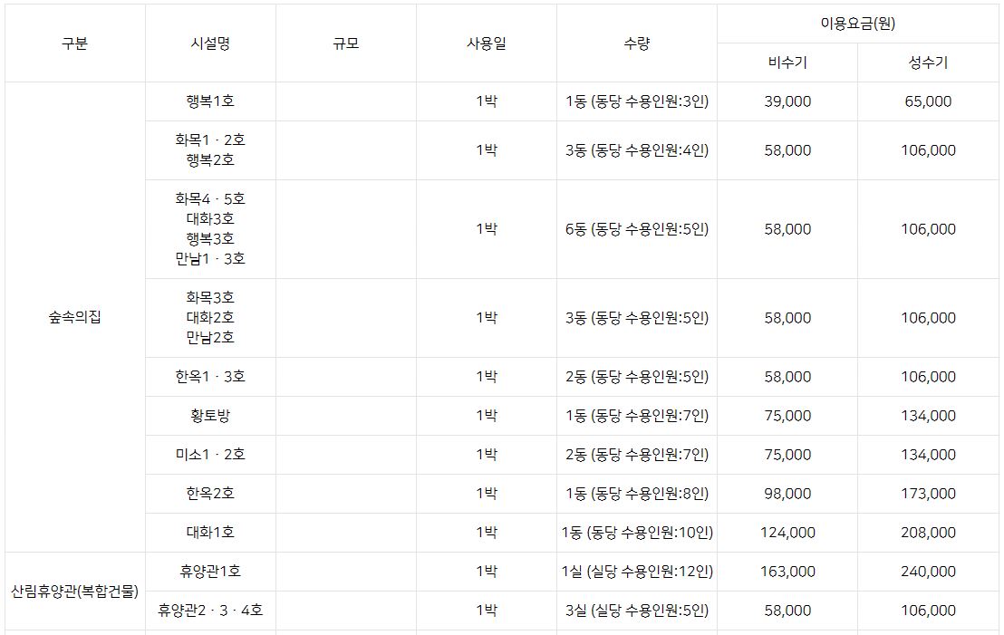 - 예약 가능 시설: 펜션, 캠핑장, 글램핑, 산림욕장, 레포츠시설