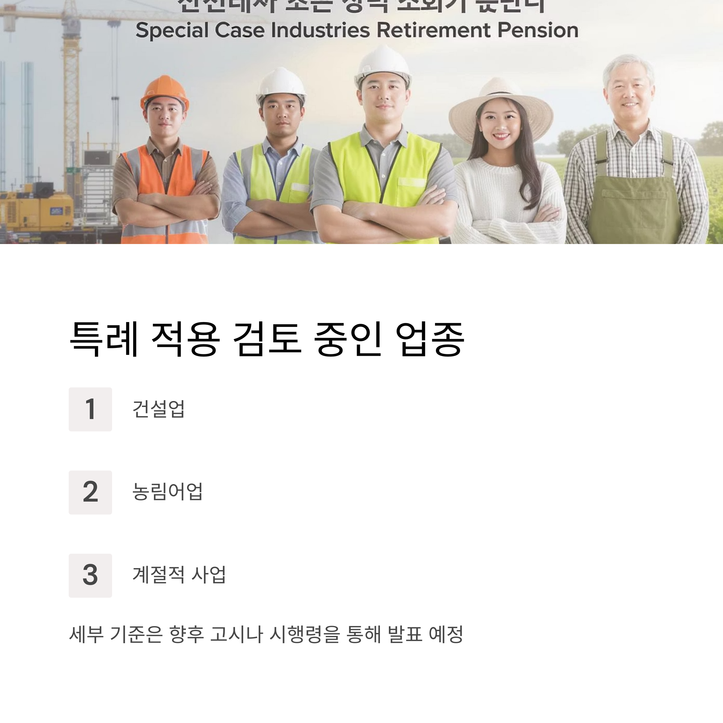 건설업, 농림어업, 계절적 사업 등은 고용 구조가 일반 업종과 달라 특례 적용이 검토되고 있습니다. 이는 근로 형태나 근속 기간, 계약 형태 등이 유동적인 업종 특성을 반영하기 위한 조치입니다.