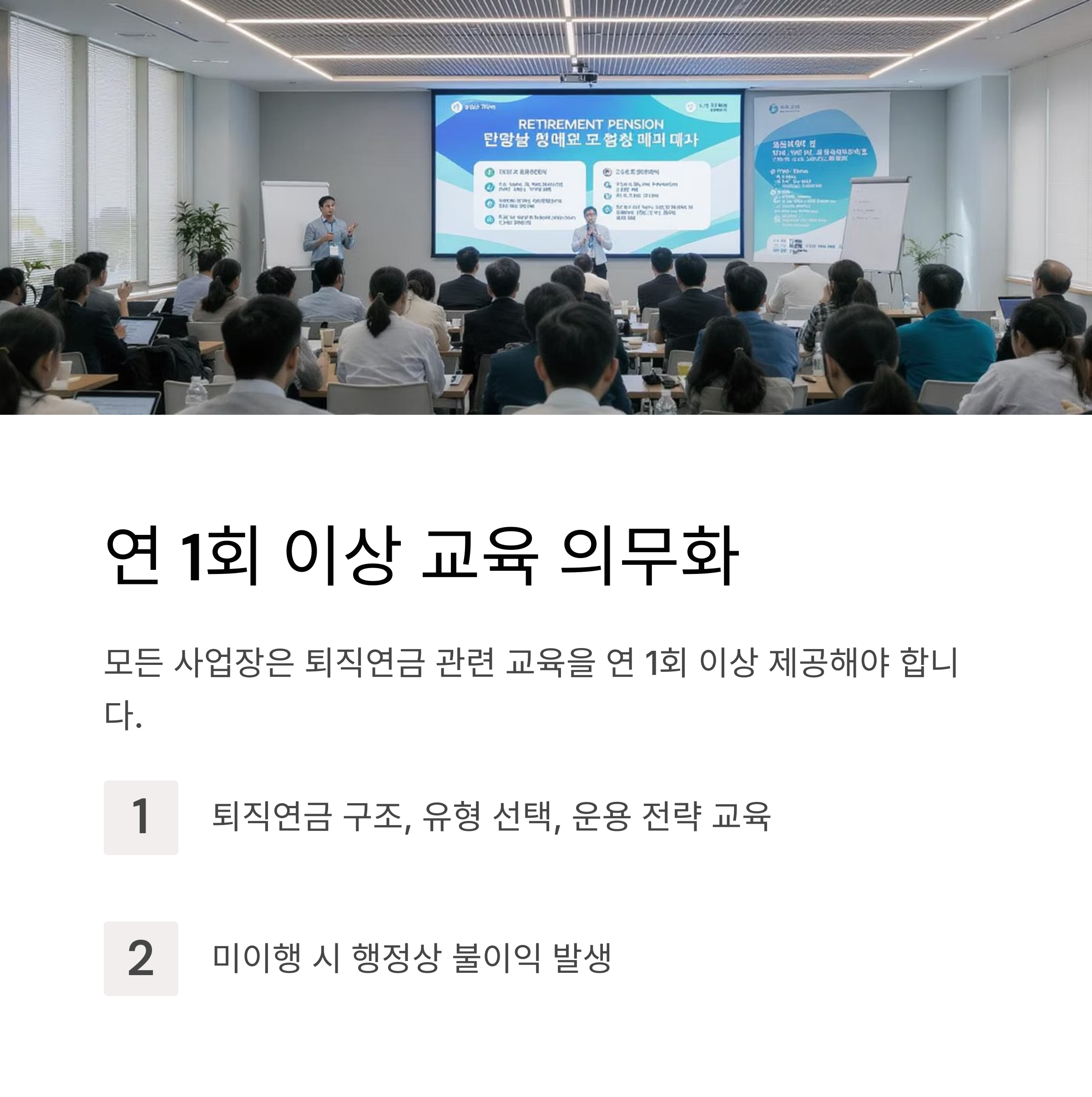 모든 사업장은 소속 근로자에게 연 1회 이상 퇴직연금 관련 교육을 의무적으로 제공해야 합니다. 퇴직연금의 구조, 유형 선택 방법,