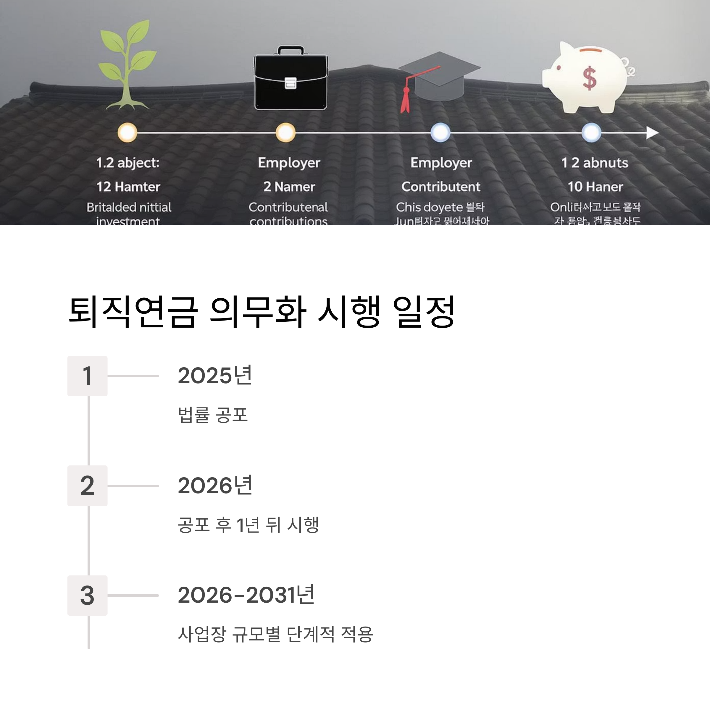 퇴직연금 의무화는 2025년 중 법률이 공포된 후 정확히 1년 뒤부터 시행됩니다.
