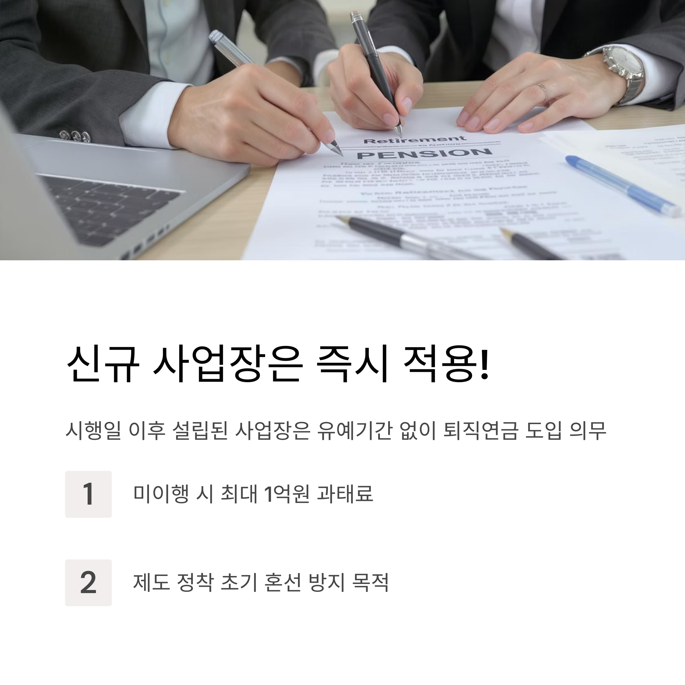 새롭게 창업하거나 법인이 설립되는 경우에는 시행일 이후 즉시 퇴직연금 제도를 도입해야 합니다. 유예기간 없이 바로 적용되며,