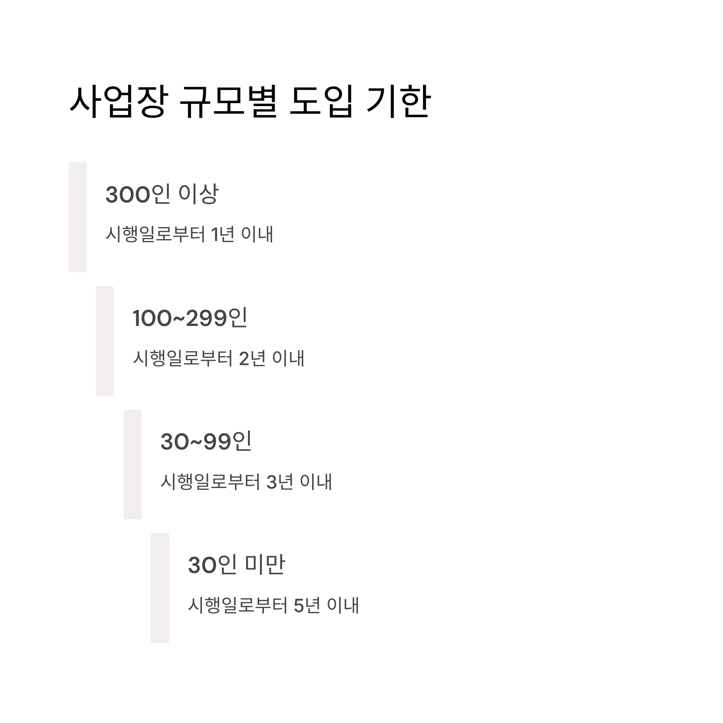 사업장 규모에 따라 유예 기간이 다르게 설정되며, 최대 5년까지 도입 시기를 늦출 수 있도록 되어 있습니다.