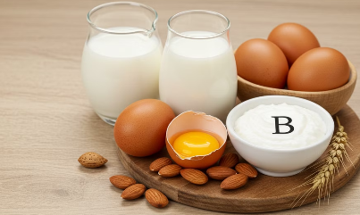 비타민 B2: 뇌 에너지 대사 촉진 & 두통 예방 (달걀, 우유, 아몬드 섭취)