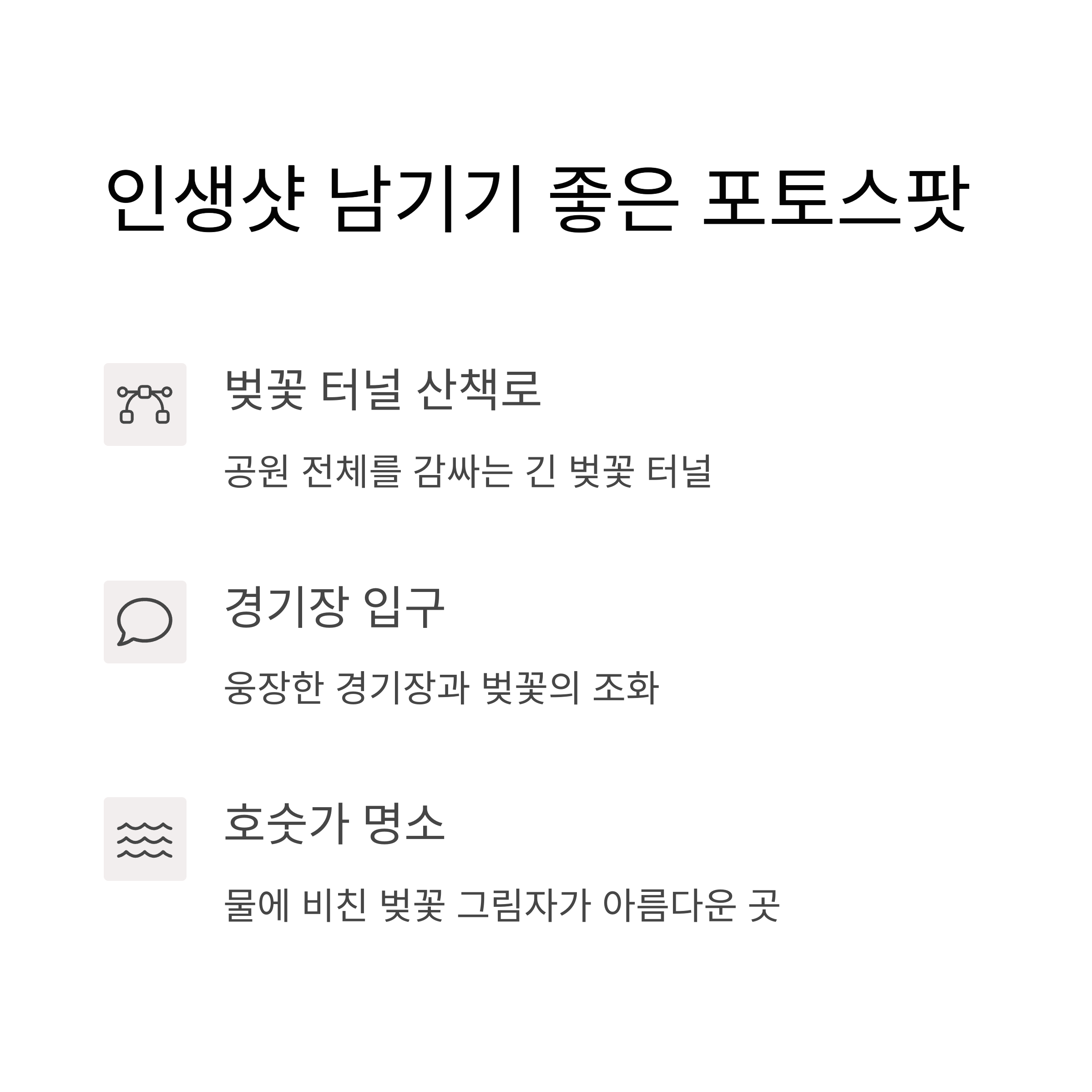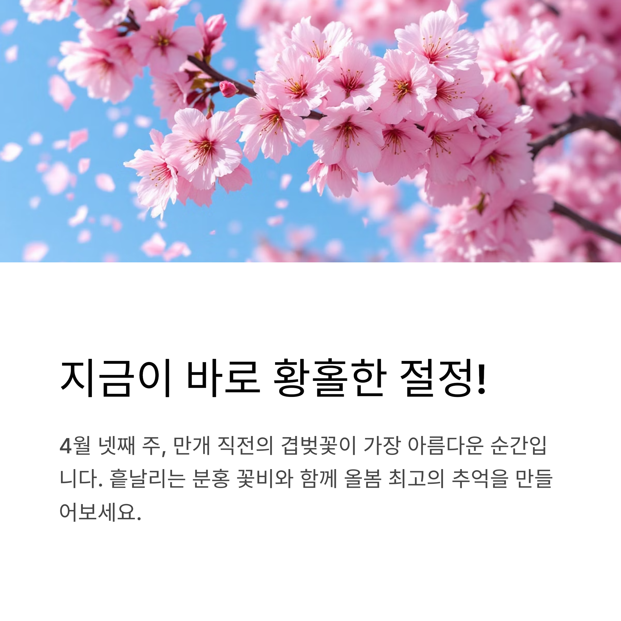 "복잡한 교통 없이도, 바로 도착해서 벚꽃과 만날 수 있어요 🚶"