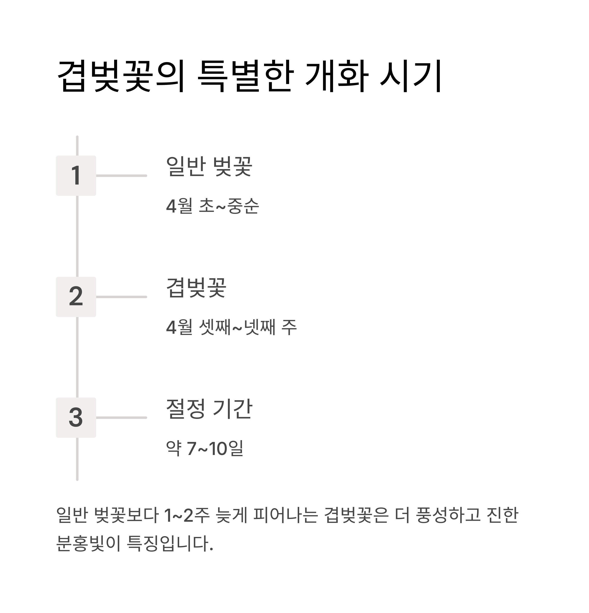 겹벚꽃은 일반 벚꽃보다 대체로 10일에서 2주 정도 늦게 개화합니다.