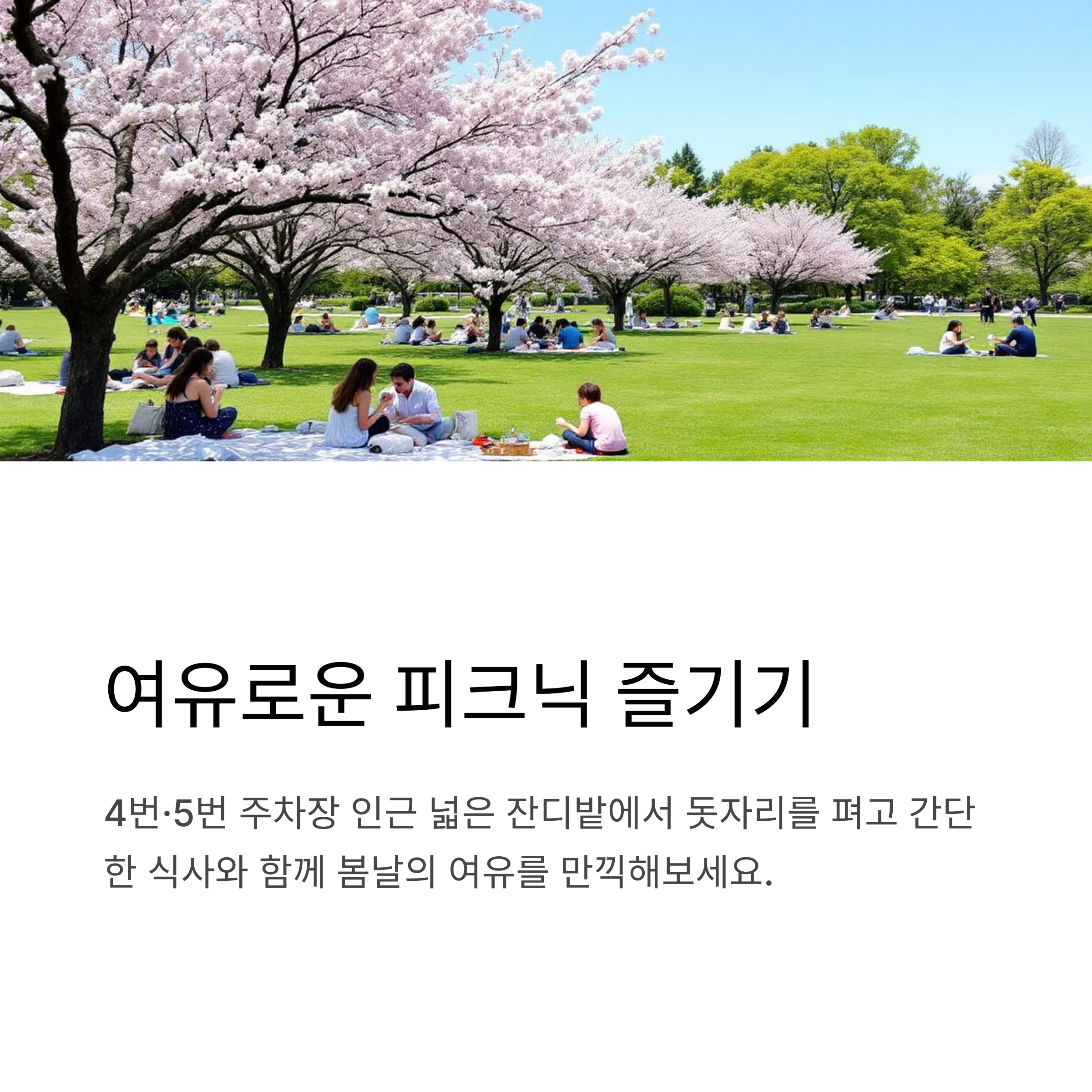 4번·5번 주차장 인근은 주차 후 바로 펼쳐지는 겹벚꽃 그늘 아래 피크닉이 가능한 명소입니다.